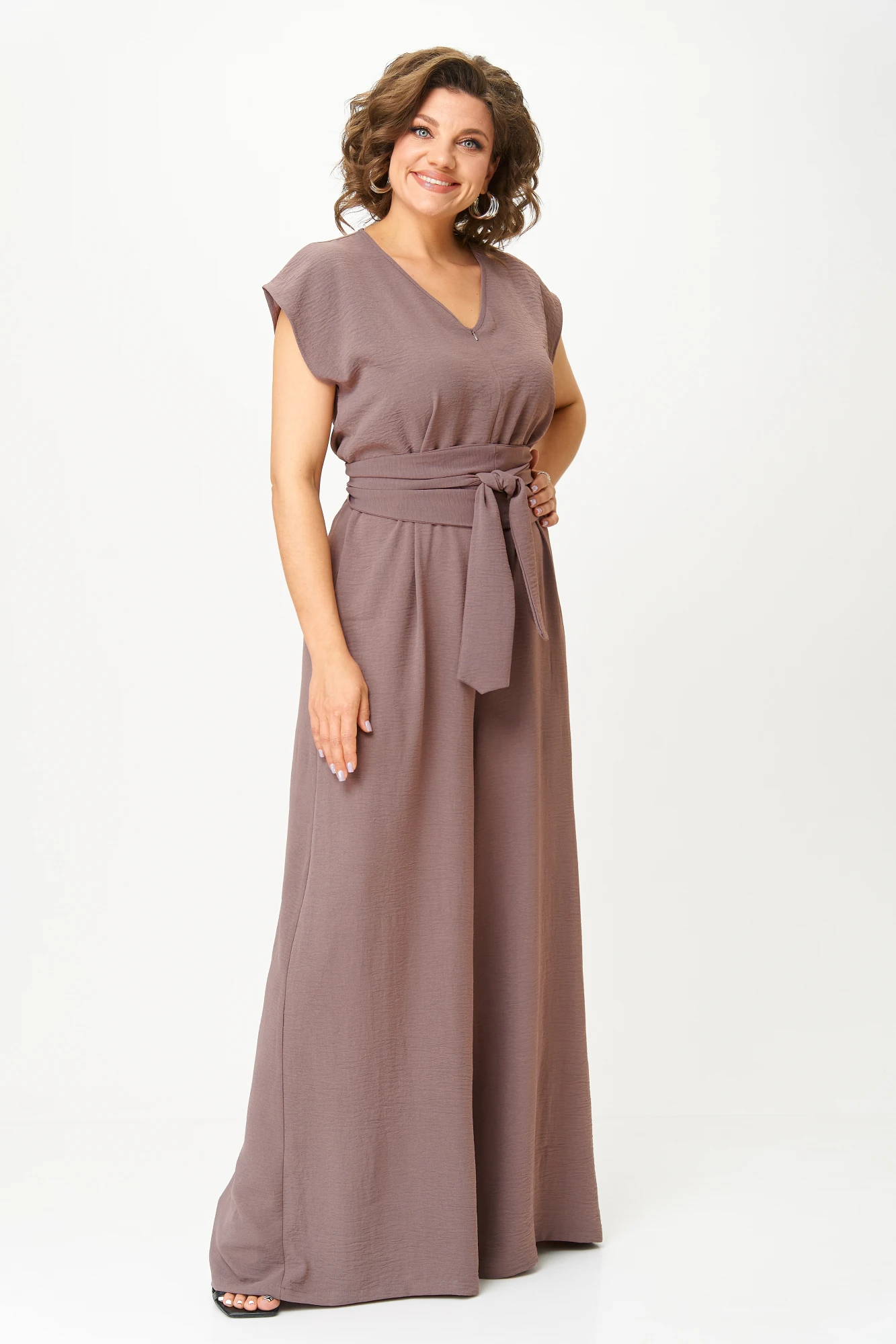 Комбинезон прямого, свободного силуэта, выполнен из однотонной ткани. Полочка комбинезона с V-образной горловиной и застежкой в среднем шве на потайную молнию. Спинка со средним швом. Рукав короткий, цельнокроеный. В области бедер в боковых швах обработаны прорезные карманы. По талии комбинезон фиксируется поясом “кушак”. В нижней части комбинезна половинки брюк широкие, типа “палаццо“.