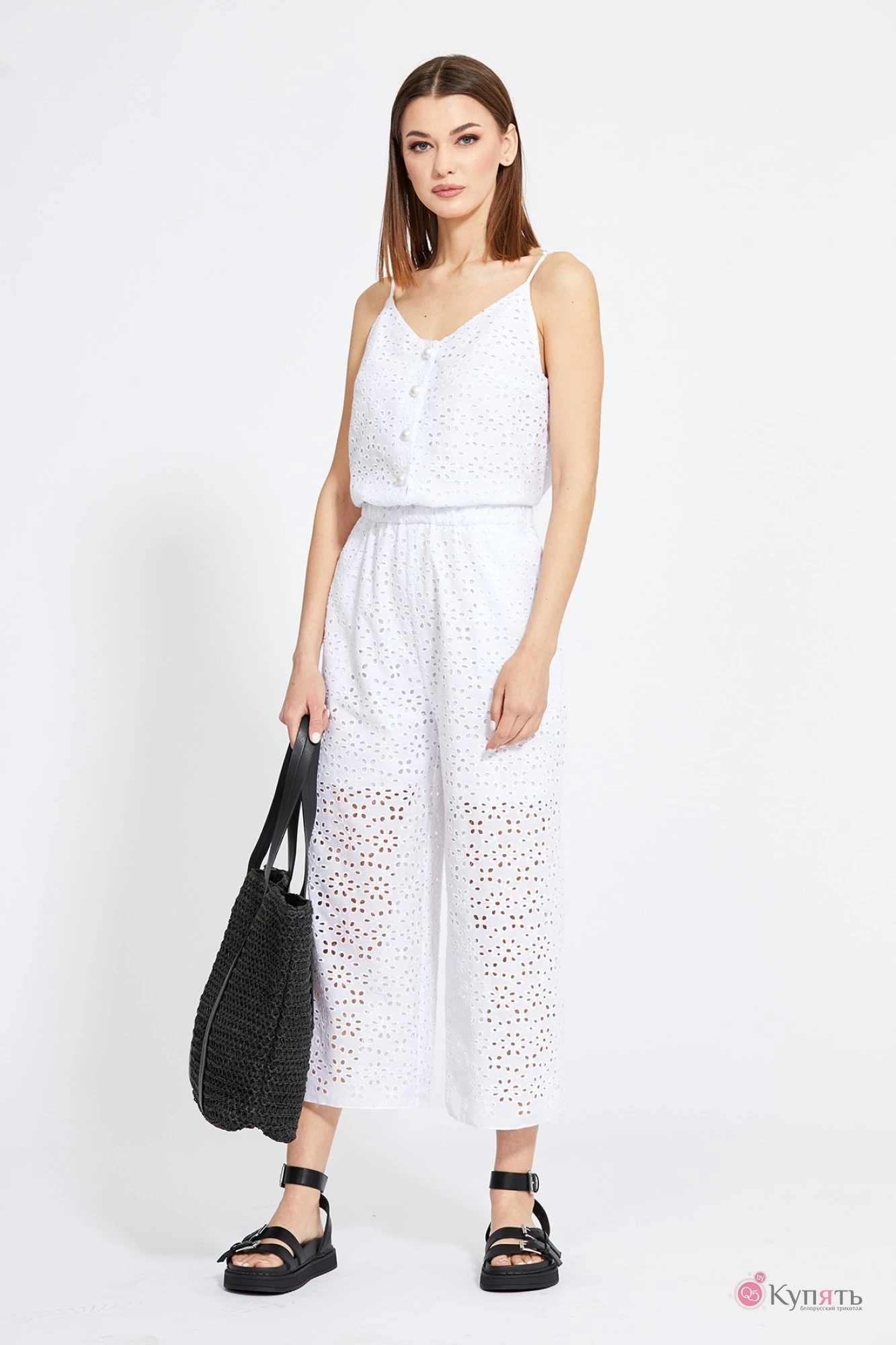 Комбинезон выполнен из ткани с вышивкой "ришелье". Комбинезон полуприлегающего силуэта, отрезной по линии талии, длиной 7/8. Затежка спереди на пуговицы. Спинка цельная. Перед лифа на подкладке. Лиф на регулируемых бретелях. Комбинезон притален поясом с эластичной тесьмой. В боковых швах - карманы. Брюки комбинезона на подкладке длиной до середины бедра. Низ брюк комбинезона без фестонов.