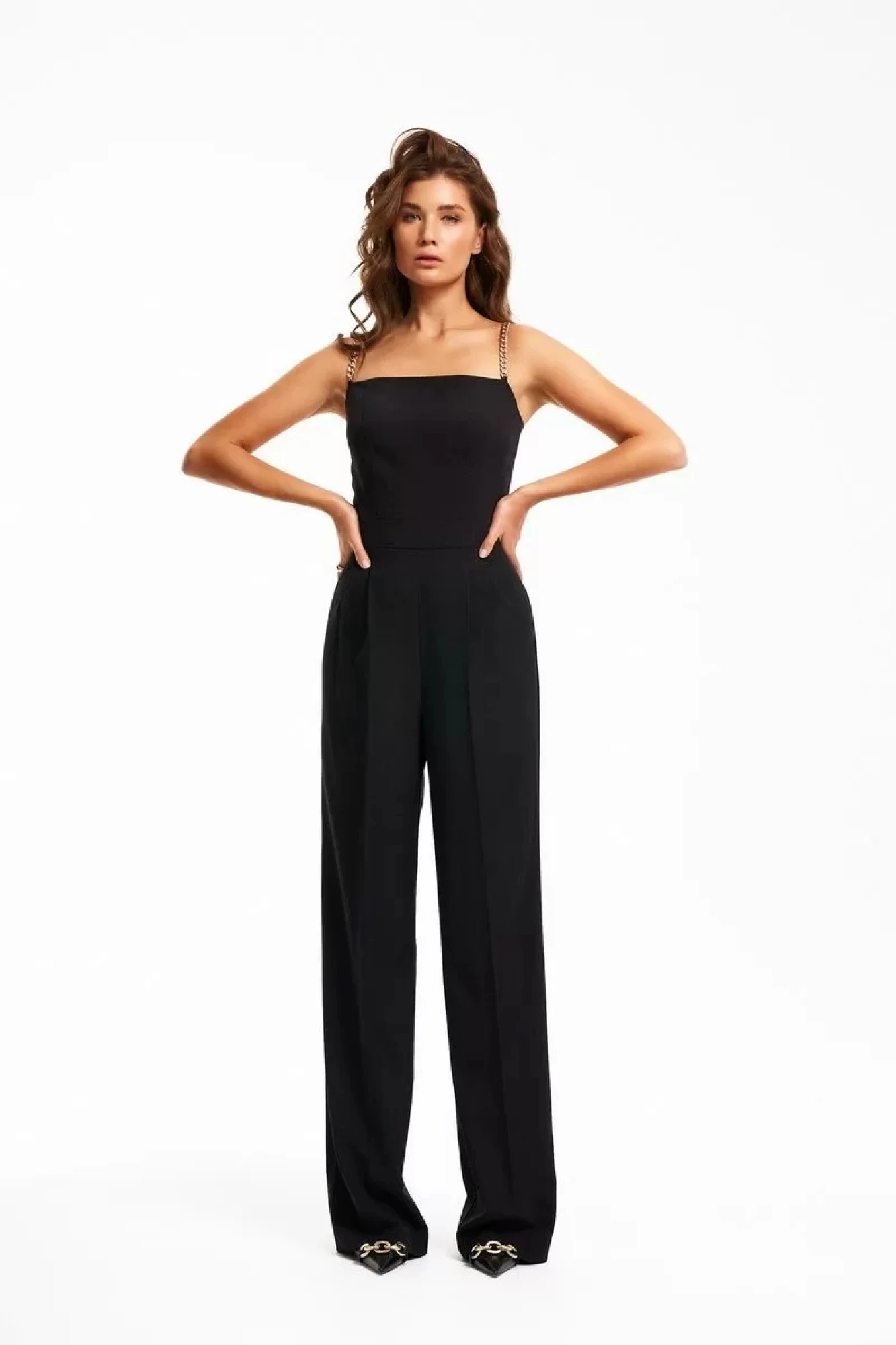 Нарядный комбинезон на бретелях из золотых цепочек. Верх изделия выполнен в виде корсета, брюки прямые от бедра с заложенной складкой по талии и заутюженным защипом. Застёжка на потайную молнию в боковом шве.