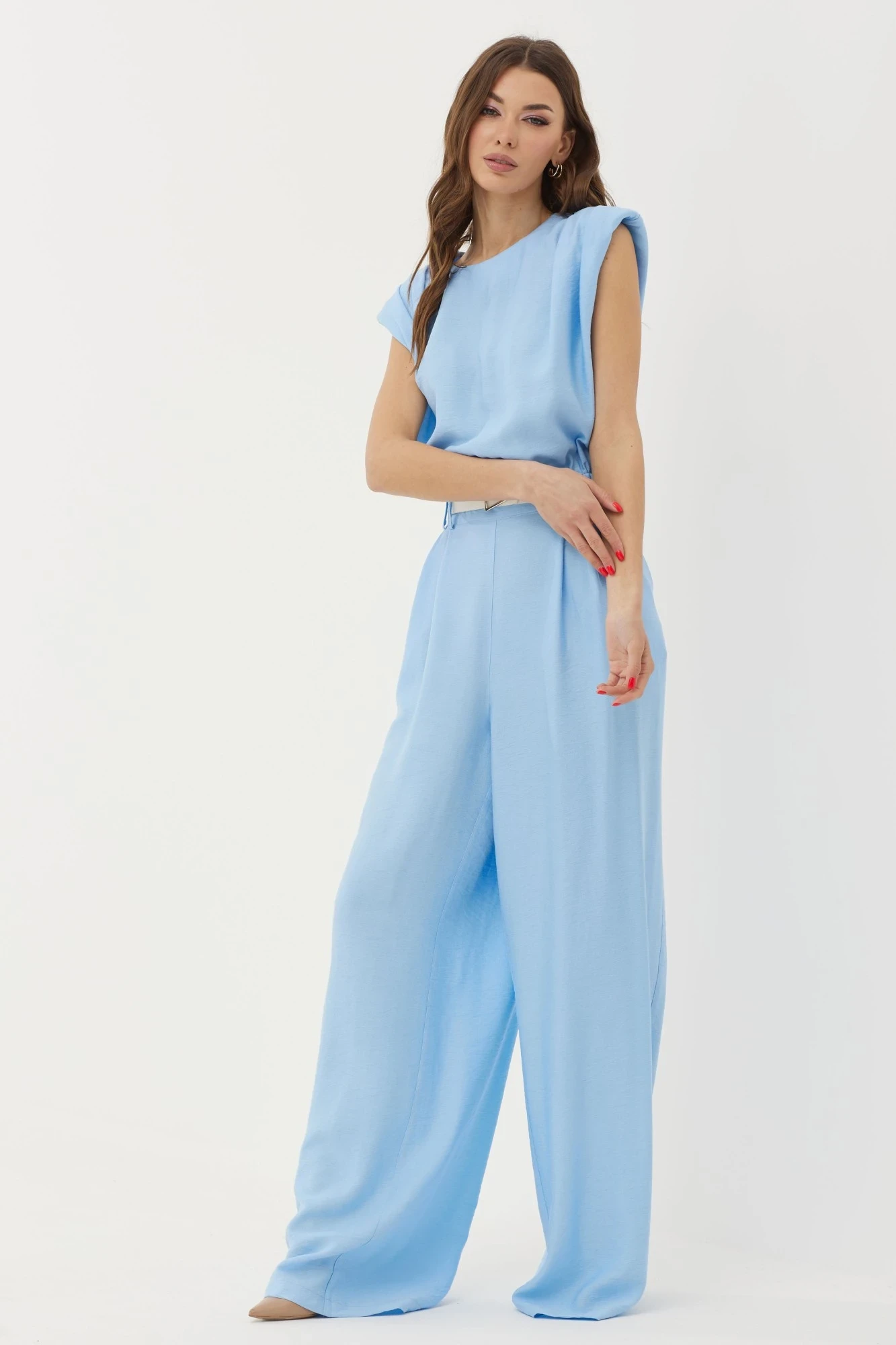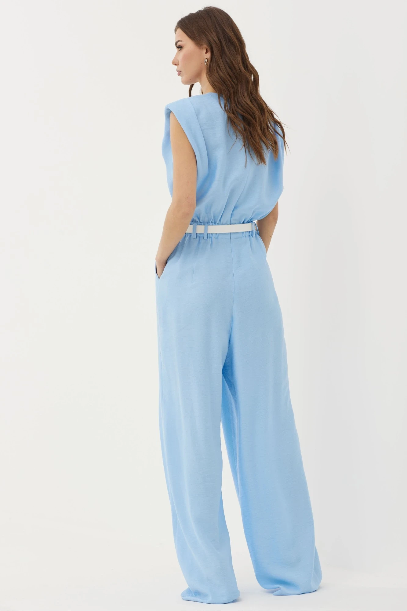 Стильный комбинезон полуприлегающего силуэта с расширенными книзу брюками из вискозной ткани. Горловина округлая. Брюки прямого силуэта со складками по переду и наклонными карманами. Лиф прямого кроя со сборкой по низу. По переду и спинке складки выходящие из плечевого шва. Плечо расширено, предусмотрены плечевые накладки. Лиф соединен с брюками притачным поясом с резинкой на уровне бокового шва и шлевками для ремня. По среднему шву спинки от горловины потайная молния.