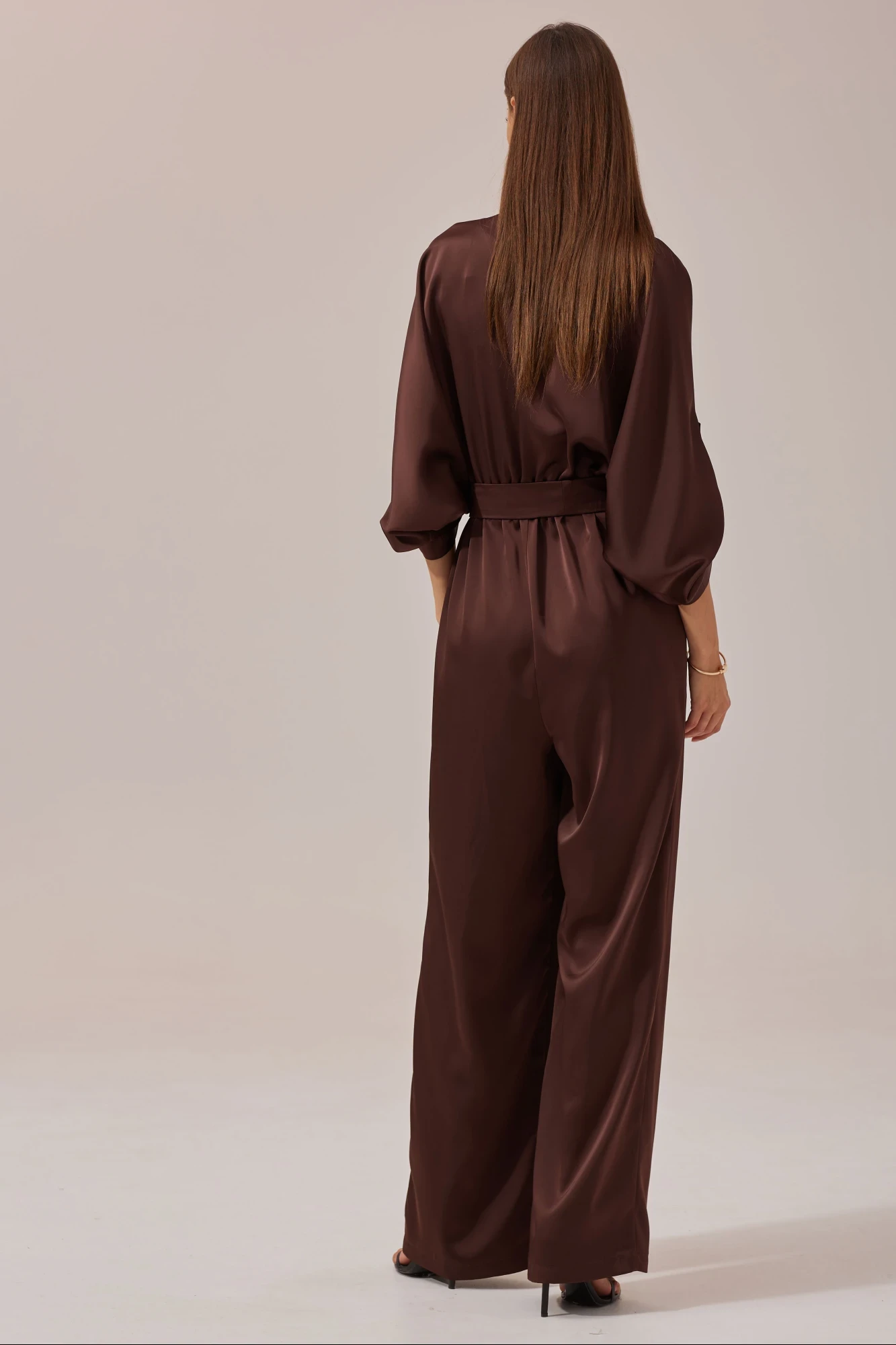 Комбинезон полуприлегающего силуэта из струящейся ткани. Горловина с V –образным вырезом с застежкой по центру на петли и пуговицы. Рукав покроя летучая мышь, по низу манжета. Для регулирования длины рукава по плечевому шву предусмотрена пата. Комбинезон отрезной по линии талии, в подрез вставлена резинка. Брюки прямого покроя, на передних половинках обработаны наклонные карманы и складки. В комплект входит съемный пояс.
