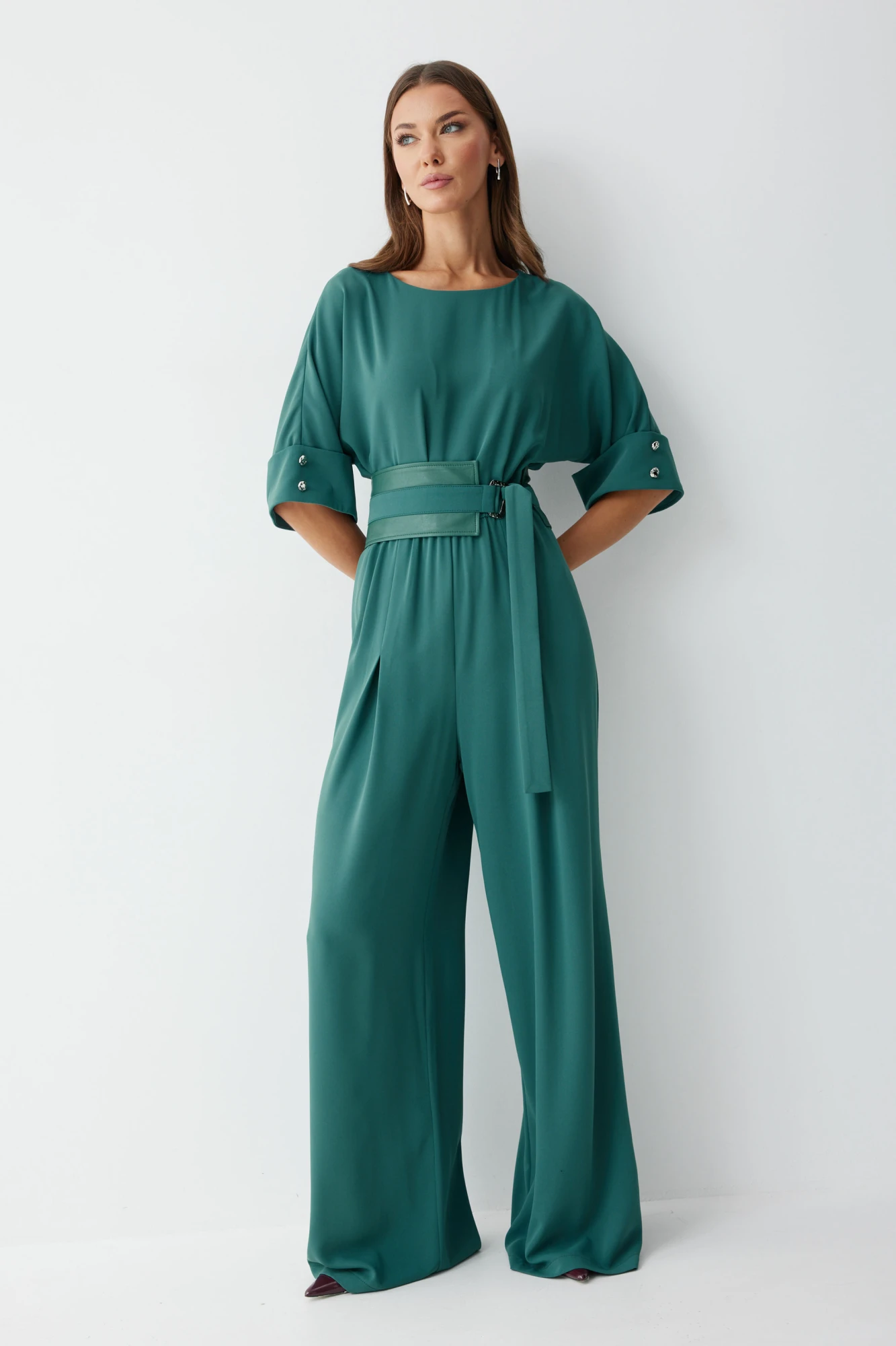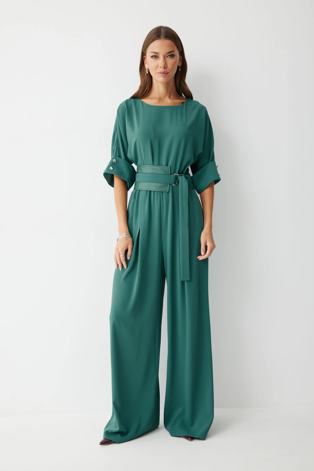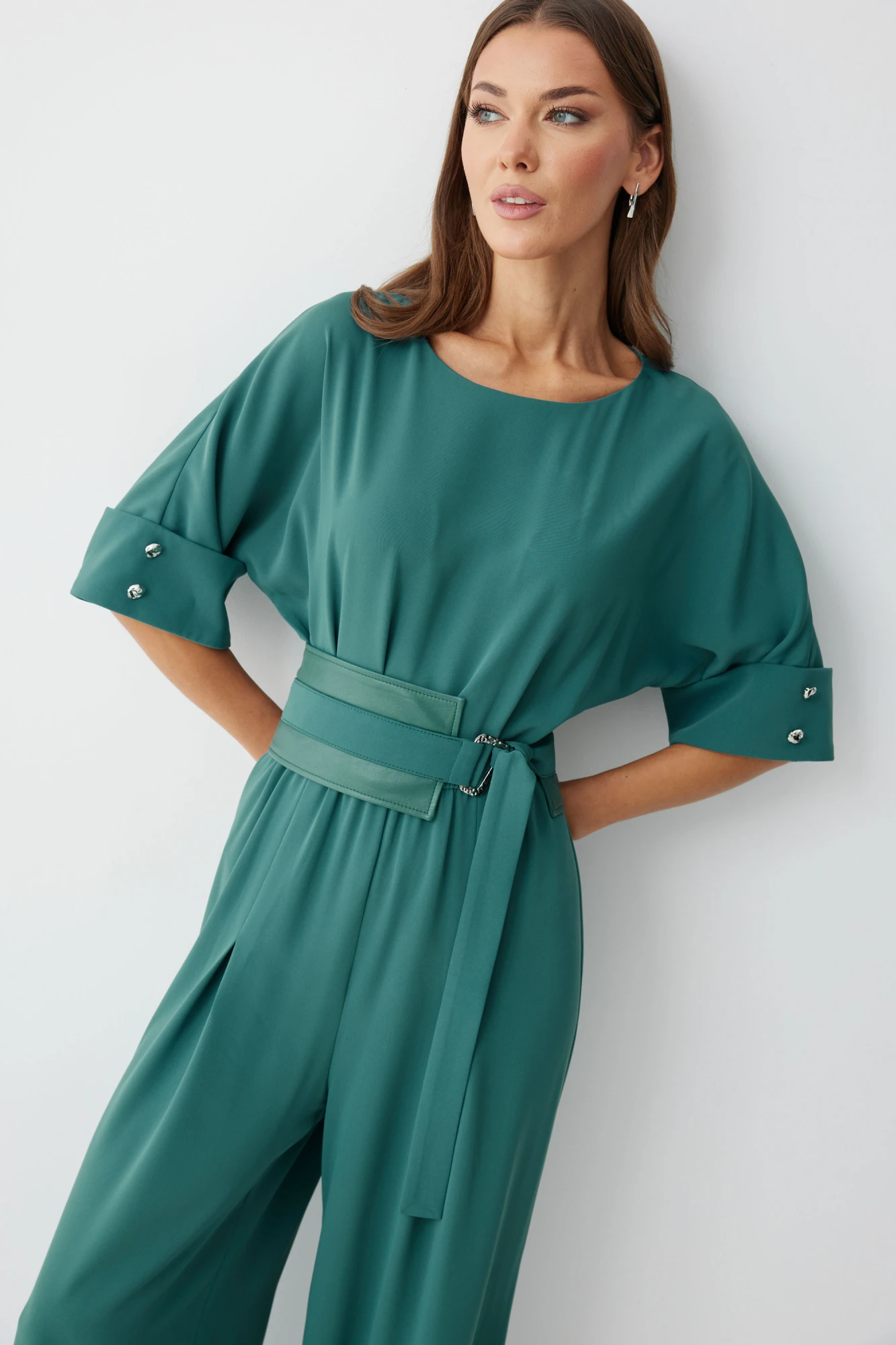 Комбинезон полуприлегающего силуэта, из струящейся ткани. Брюки прямого силуэта, со складками по переду. Комбинезон отрезной, по линии талии на резинке. Рукав цельнокроеный на манжете, длиной до локтя. Горловина округлая. В комплект входит пояс скомбинированный из экокожи и основной ткани. Обращаем ваше внимание, что фурнитура может незначительно отличаться от фото.