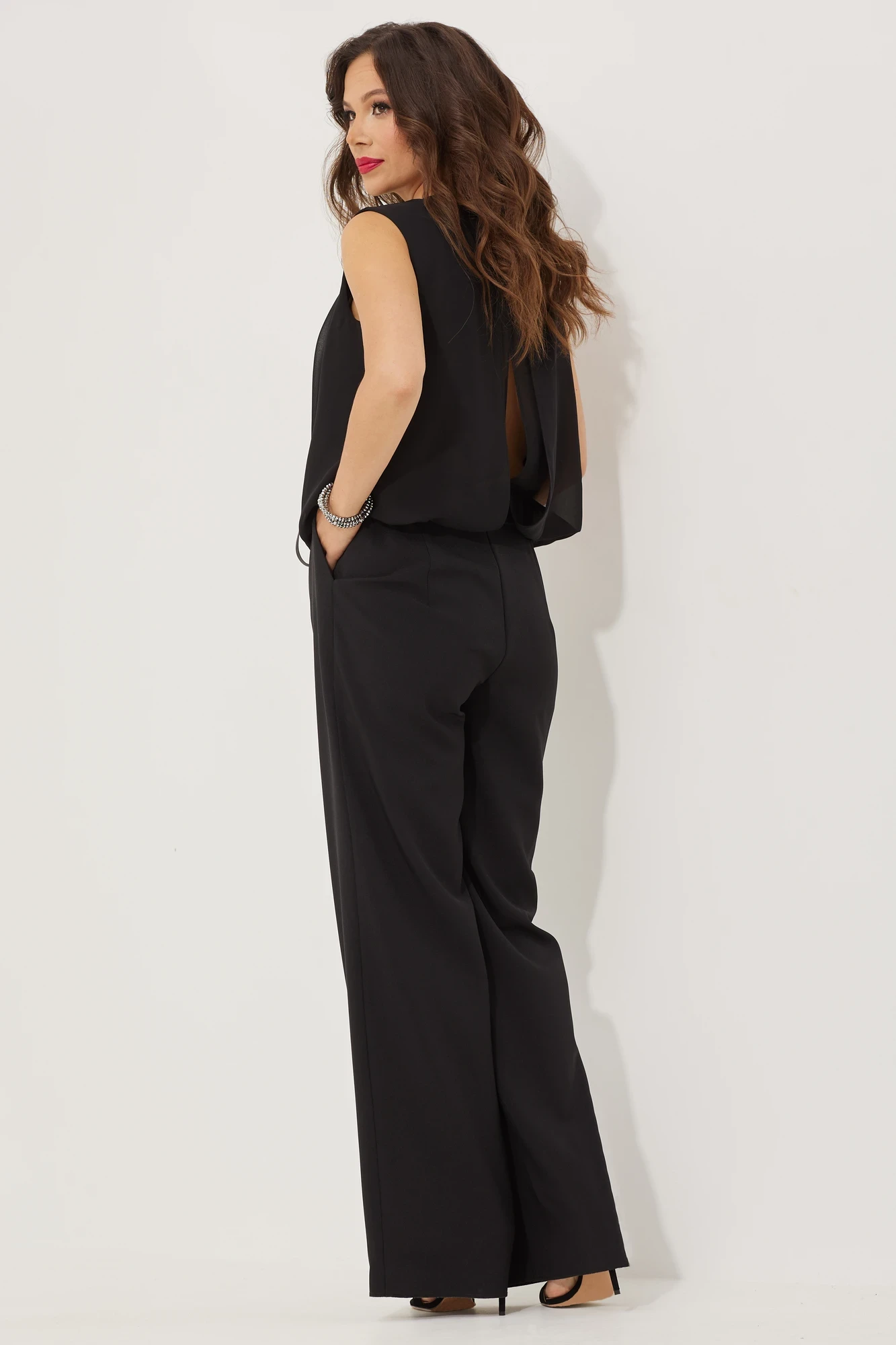 "Стильный комбинезон полуприлегающего силуэта . Выполнен из струящейся костюмно-плательной ткани в сочетании с шифоном и отделкой атласными лентами. Талия отрезная. Верхняя часть комбинезона с напуском. Выполнена путем наложения нескольких слоев из шифона, создавая эффект многослойности и образовывая красивый вырез по спинке. Застежка по спинке на пуговицу. Нижняя часть выполнена из костюмно-плательной ткани. Брюки комбинезона прямого кроя с притачным поясом, дополненным эластичной тесьмой, а так же застежкой на потайную молнию. Комбинезон дополнен функциональными боковыми карманами.