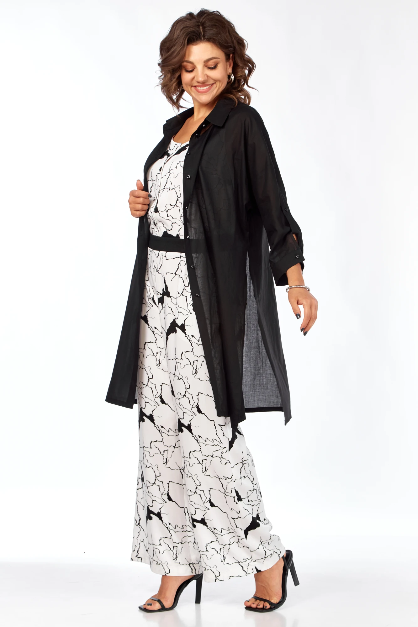 Комплект женский 2-х предметный, состоящий из комбинезона и блузки. Блузка женская, удлиненная. Прямого силуэта. С разрезами по бокам, с воротником рубашечного типа на отрезной стойке. Застежка центральная с цельнокроеной планкой на 8 петель-пуговиц. Рукав на спущенной линии плеча, длиной 3/4, на отрезной манжете по низу с застежкой на петлю-пуговицу. По низу рукава, от манжеты, заложена складка и имеется пата. Комбинезон отрезной по талии, в пояс частично вставлена резинка, с карманами -хулиганами в боковых швах. По переду обработана планка на петли-пуговицы. Комбинезон на широких бретелях, с частичной резинкой.