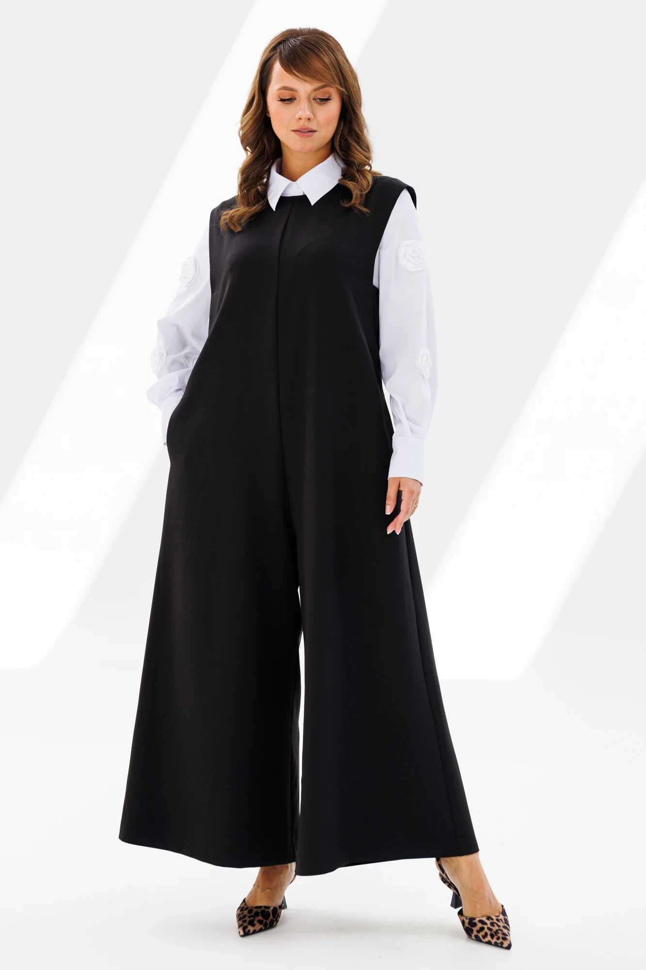 Комбинезон свободного прямого силуэта, выполненный из костюмной ткани (немного тянется). По переду средний шов. По спинке – декоративная металлическая молния в среднем шве. Горловина округлой формы. По боковым швам отрезные ластовицы и функциональные карманы.