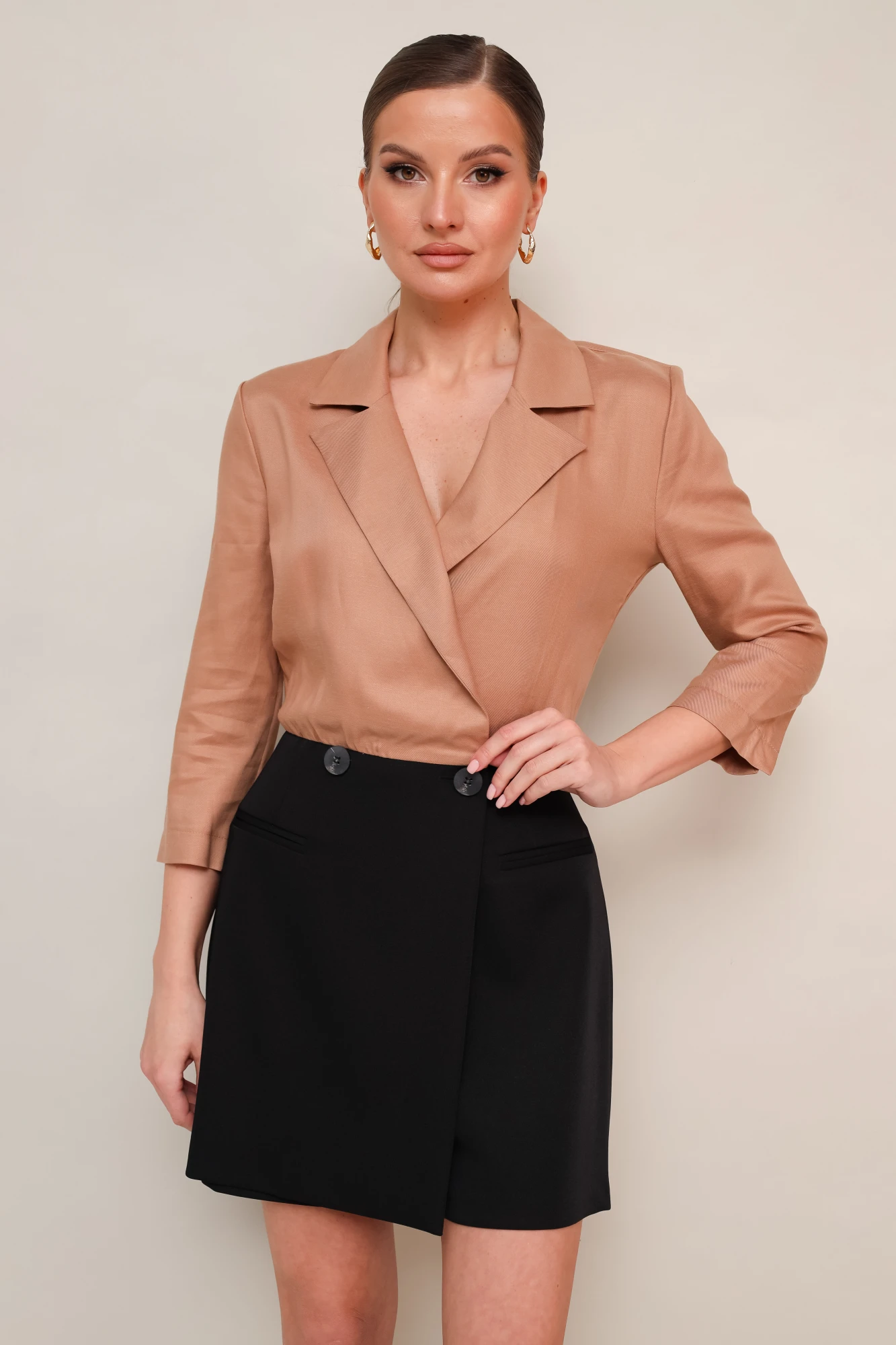 Стильный комбинезон с имитацией двубортной застежки, отрезной по линии талии. Лиф с воротником пиджачного типа с отложными лацканами. Рукава втачные двухшовные с отлетными шлицами, длина ¾. Юбка-шорты с центральной застежкой на потайную тесьму молнию. Спереди по юбке обработаны карманы в рамку. Лиф и рукава выполнены из вискозы, юбка-шорты – из костюмно-плательной ткани.