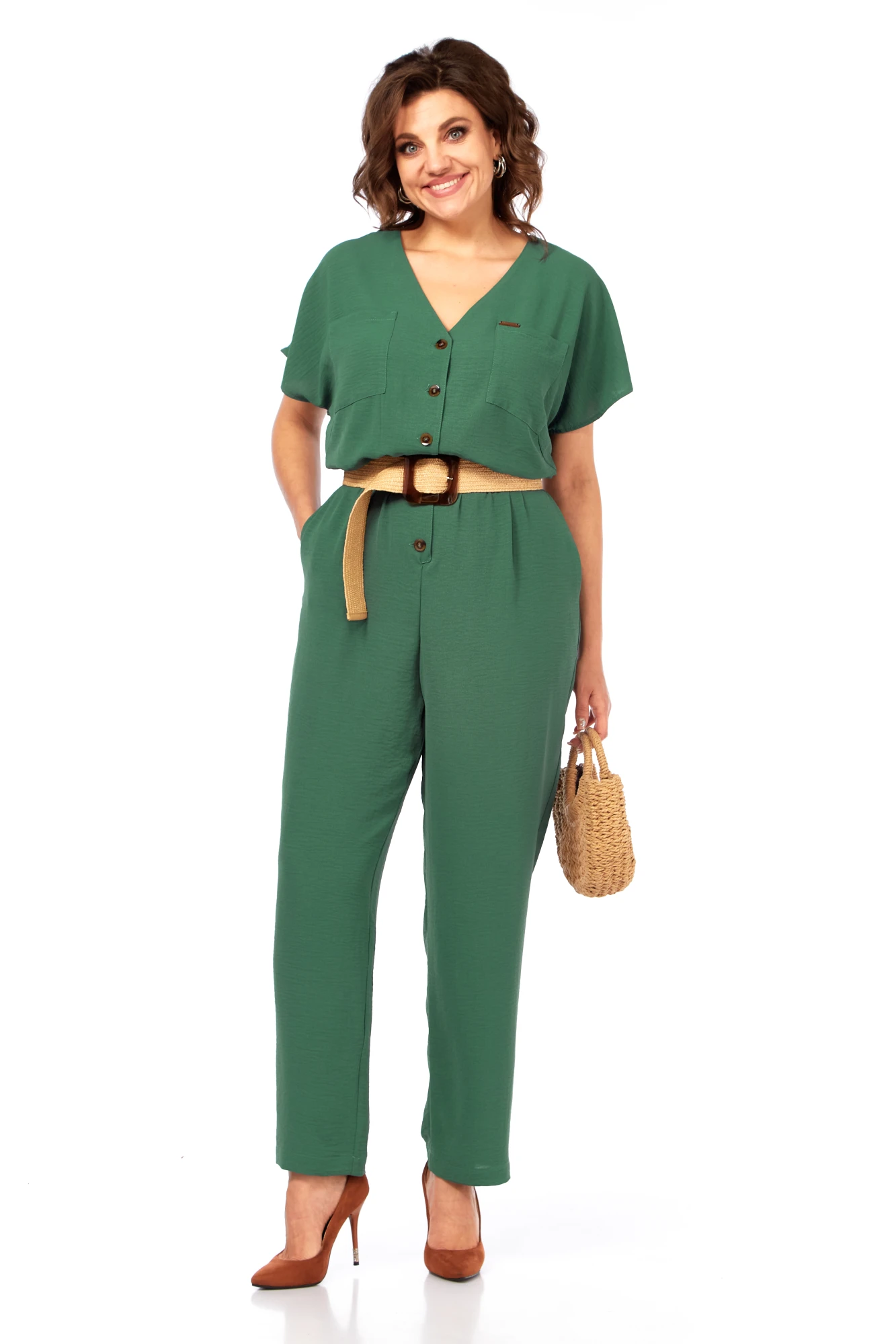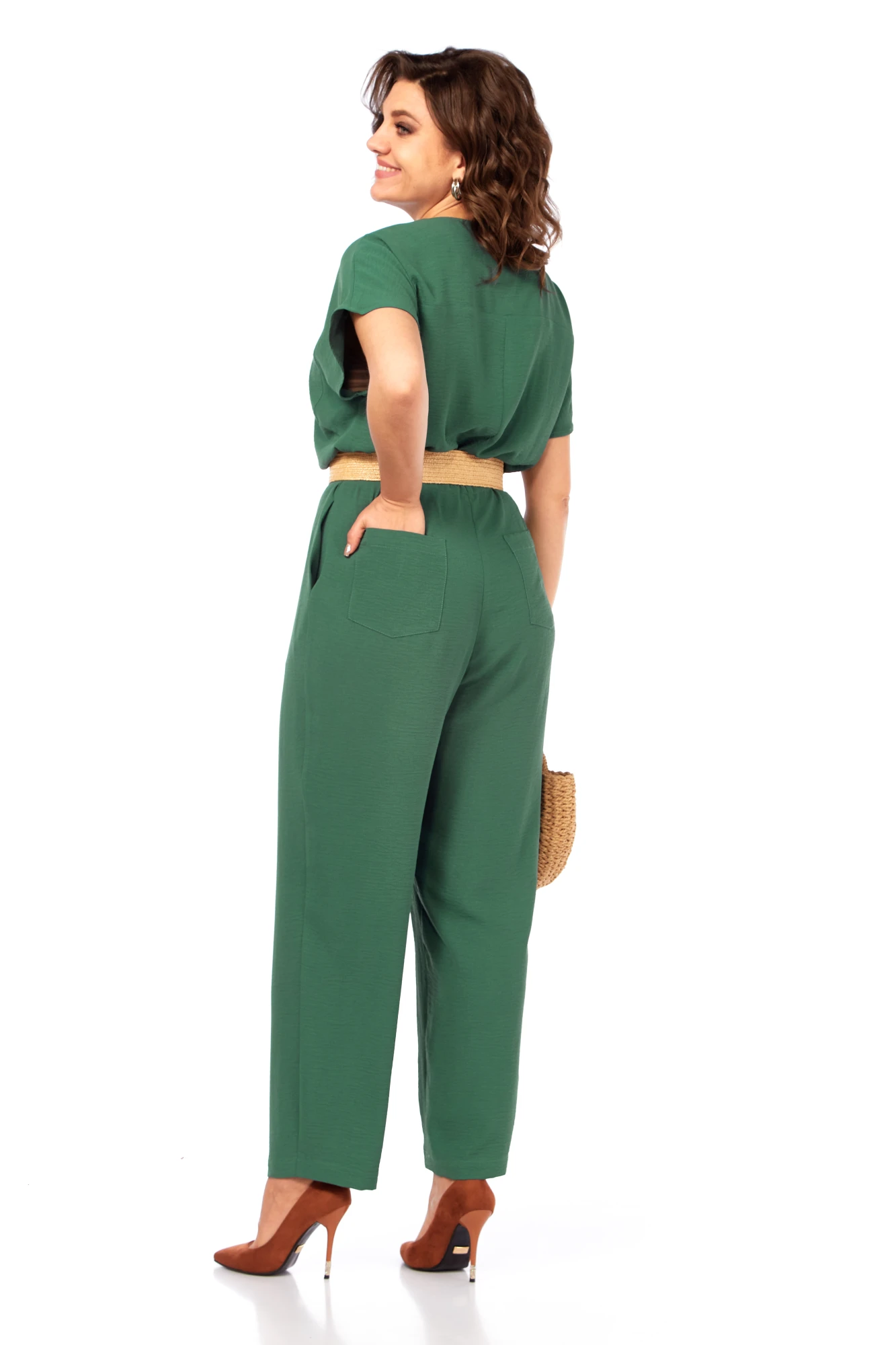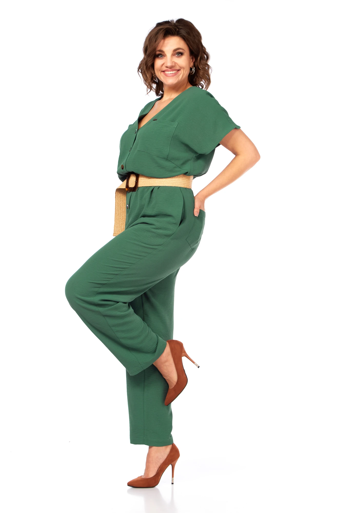 Комбинезон женский свободного силуэта со спущенной линией плеча. По переду центральная застежка на петли-пуговицы. Вырез горловины комбинезона – V-образной формы. В боковых швах – карманы. По линии талии настрочена кулиса с эластичной тесьмой. По переду лифа и задней части брюк настрочены накладные карманы. Комбинезон дополняет съемный пояс-резинка.