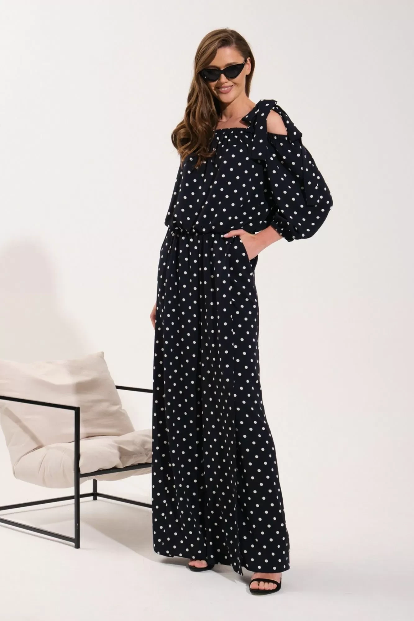 В левое плечо вставлены декоративные бретели, создающие элегантный бант.