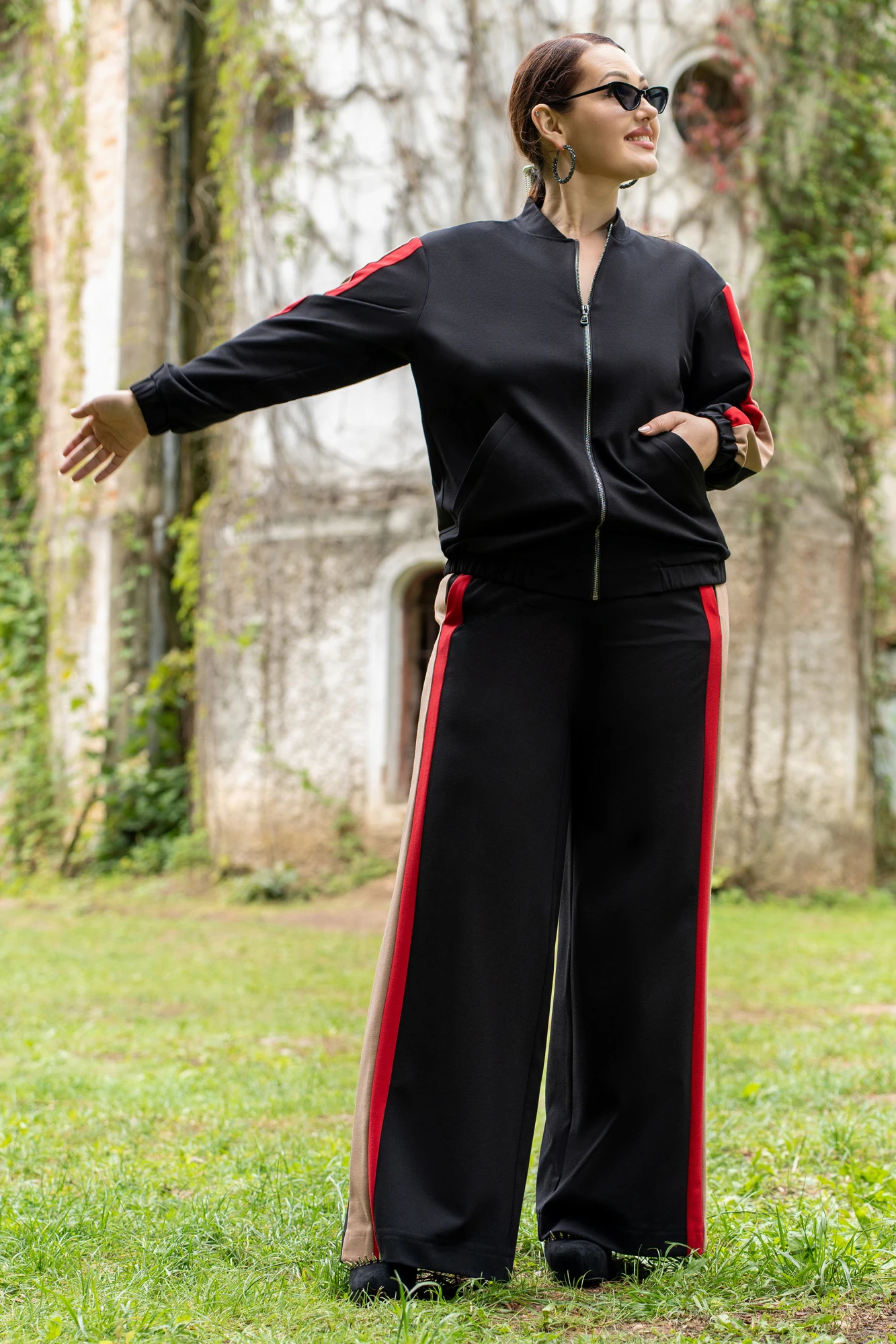 Костюм женский брючный состоящий из бомбера ,брюк. Модный соременный бомбер из премиум трикотажа, с центральной бортовой застёжкой на тесьму-молнию. Горловина круглой формы со стойкой. По низу, и по низу рукавов обработаны манжеты с эластичной резинкой, на полочках прорезные карманы с листочками и отделочными строчками. Рукава втачные со вставками по центру рукавов, по низу с притачной манжетой с эластичной резинкой. Спинка цельная. Брюки женские прямого кроя, на притачном поясе по переду и с резинкой по спинке. Передние половинки с карманами в швах. Брюки по боковым швам со вставкой из конрастной ткани. По передней вставке пояса обработа ны шлёвки и декоративная подвеска.