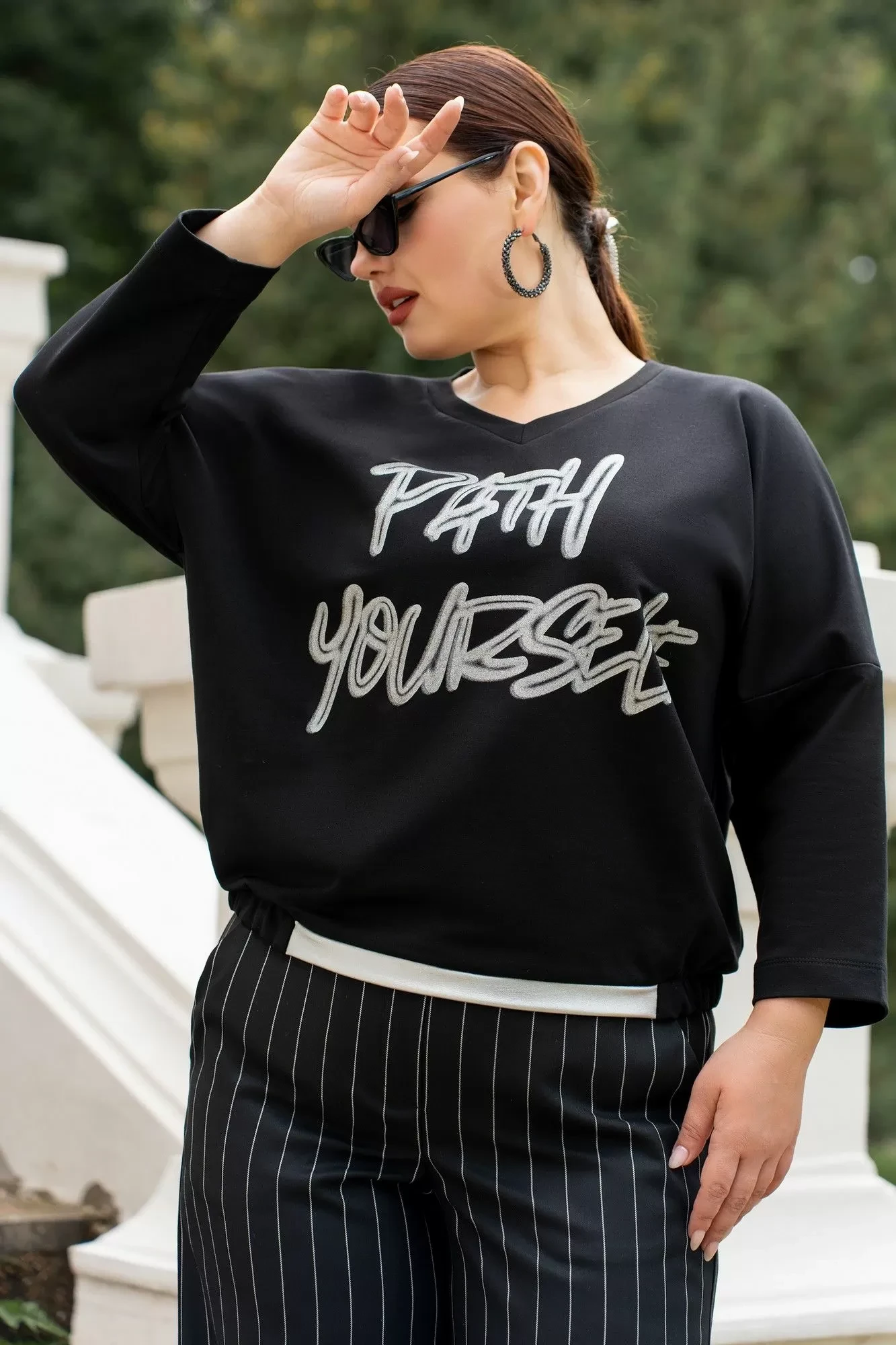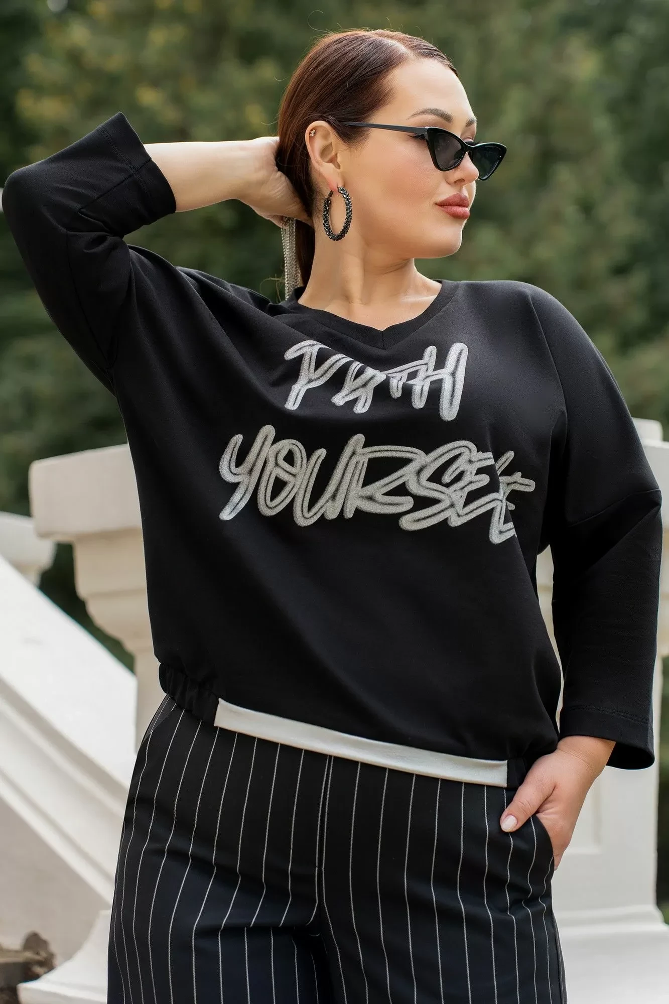 Костюм брючный,сочетание полоски и трикотажа создает шикарный образ как для работы,отдыха,так и для повседневной жизни.Джемпер выполнен из премиум трикотажа, свободного силуэта,с V-образным вырезом горловины, со спущеным плечом, рукава 7/8. По полочке серебрянная дизайнерская печать, по низу серебрянная вставка. Спинка со средним швом. Горловина обработана бейкой. по низу спинки и бокам с эластичной резинкой. Брюки прямого лаконичного силуэта, из класической костюмной полоски, по переду пояс вставка со шлёвками, по спинке пояс с эластичной резинкой. Брюки с боковыми наклонными карманами. Брюки со стрелками.