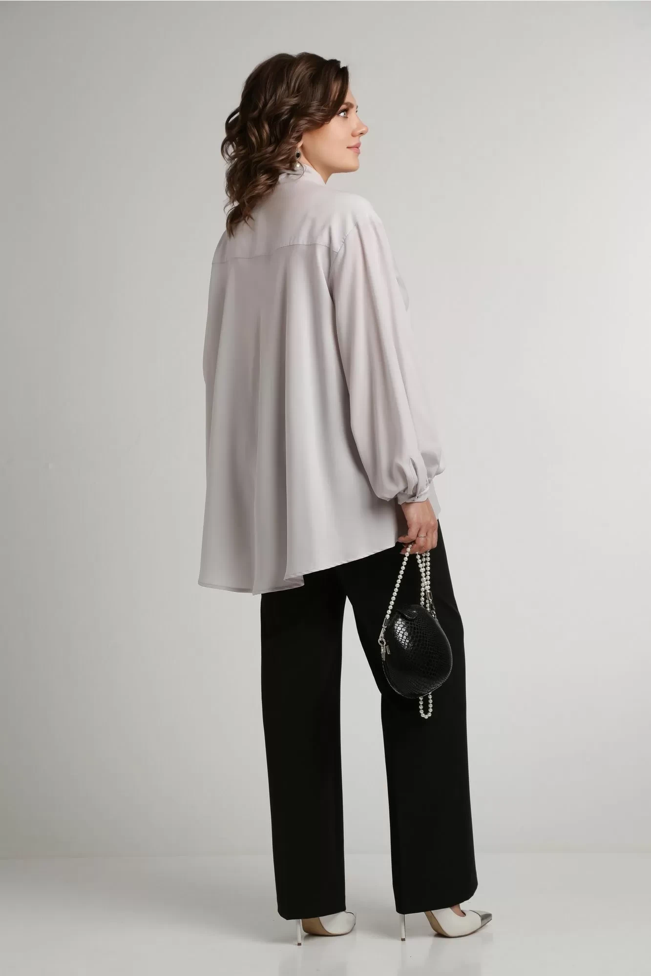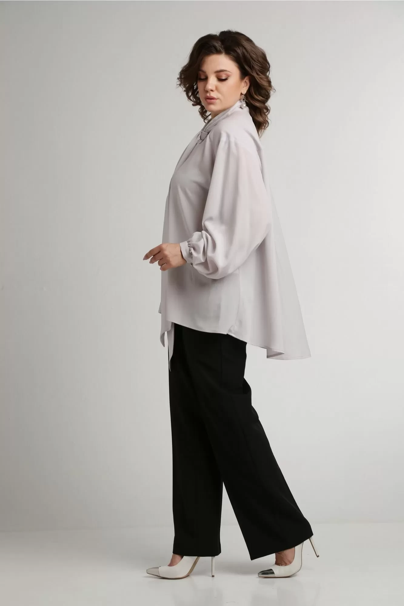 Универсальный комплект состоит из блузки и брюк. Блузка свободного силуэта с воротником аскот (воротник-бант) станет ультрамодным дополнением Вашего гардероба, а пышные рукава зачаровывают своей легкостью и воздушность силуэта. По переду центральная застежка на петли и пуговицы и спущенной линией плеча. Рукав втачной, одношовный с манжетой по низу. По спинке кокетка. Брюки прямого силуэта с заутюженными стрелками и притачным поясом. Для максимально комфортной посадки по бокам пояса вставлена эластичная резинка. Застёжка на молнию с гульфиком и пуговица по поясу. По переду в боковых швах карманы. Задние половинки брюк с талиевыми вытачками.