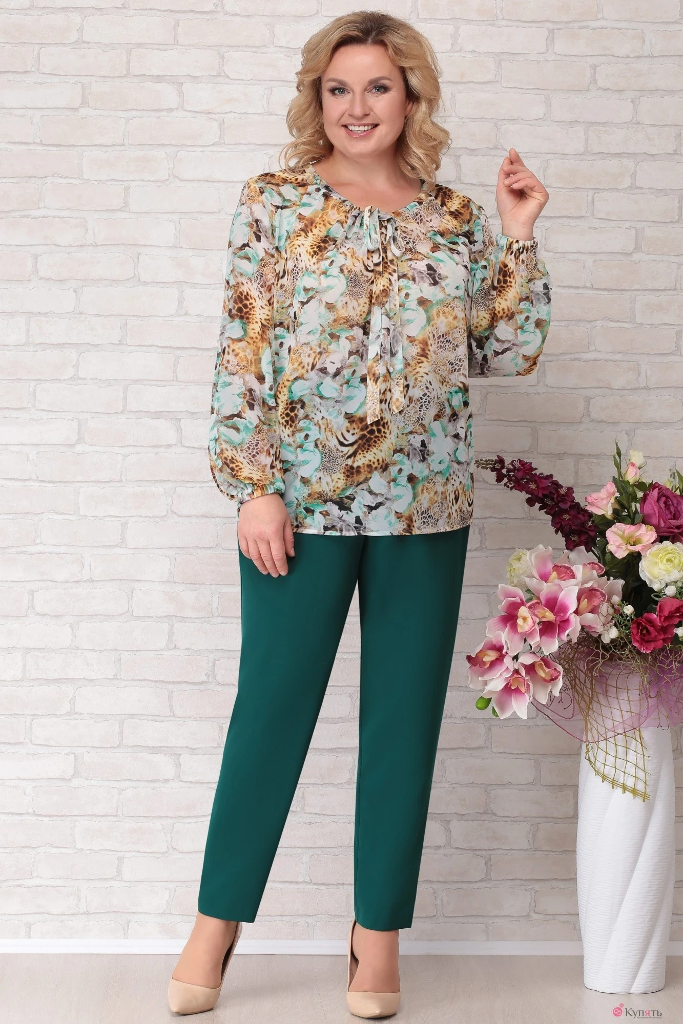 Комплект женский, состоящий из жилета, блузки и брюк. Жилет и брюки выполнены из однотонной эластичной ткани, блузка – из принтованного шифона. Жилет на подкладке, с центральной бортовой застежкой на 5 обметанных петель и 5 пуговиц, с ассиметричным воротником и пелериной на правой части переда. Пелерина входит в плечевой и боковой швы, соединена с воротником и застегивается под воротником на левой части переда на навесную петлю и пуговицу. Перед жилета с узкими боковыми частями и нагрудными вытачками, с карманами в рельефных швах. Спинка со средним швом и вытачками. Длина по центру спинки 75 см. Блузка с плечевыми накладками, с кулиской и вырезом-«капелькой» по горловине переда. Кулиска стягивается завязками из основной ткани. Перед и спинка цельные. Длина по центру спинки 64 см. Рукава втачные, одношовные, расширенные к низу. Низ рукавов присобран на резинку. Длина рукава 61 см. Горловина спинки обработана обтачкой. Брюки, зауженные к низу; на притачном поясе с резинкой по бокам, застегивающемся на одну обметанную петлю и одну пуговицу. Передние и задние части брюк с вытачками. В среднем шве передних частей брюк застежка по типу «гульфик» на тесьму-«молнию». Длина брюк 100 см.