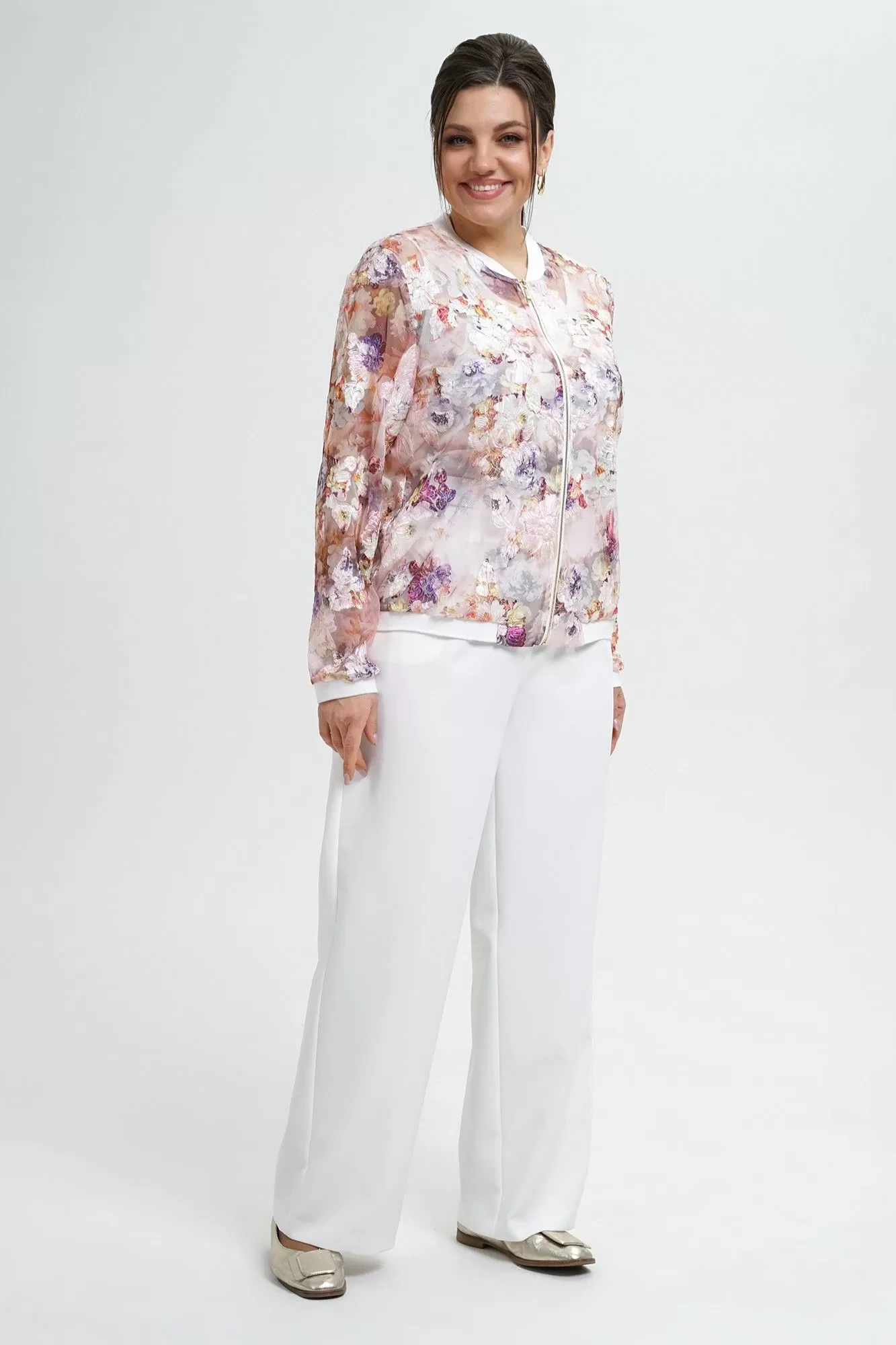 Джемпер «цветы на сетке» 70% П/Э, 25% вискоза, 5% спандекс. Блуза - 60% П/Э, 37% вискоза, 3% эластан. Брюки - 95% П/Э, 5% эластан.