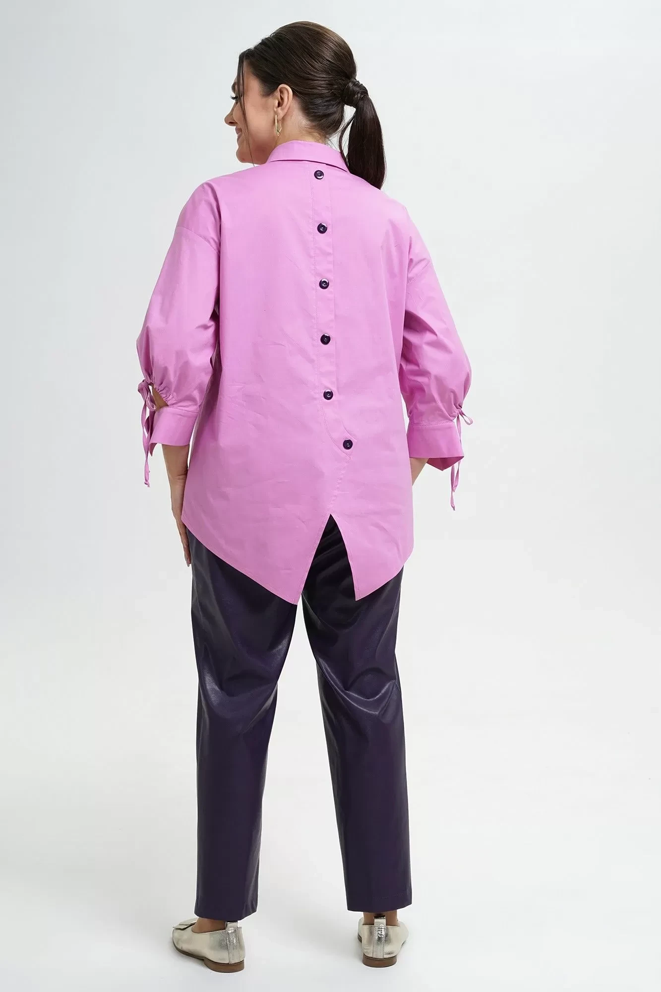 Блузка прямого, свободного силуэта, с застёжкой по фигурной планке на петли, пуговицы, со спущенной линией плеча, с фигурной линией низа. Спинка с имитацией застёжки по притачной фигурной планке с пришивными пуговицами. Рукава втачные, одношовные, длиной ¾, понизу частично собранные завязкой и с притачными манжетами на петлю, пуговицу. Воротник стояче отложной на отрезной стойке на петлю, пуговицу.
