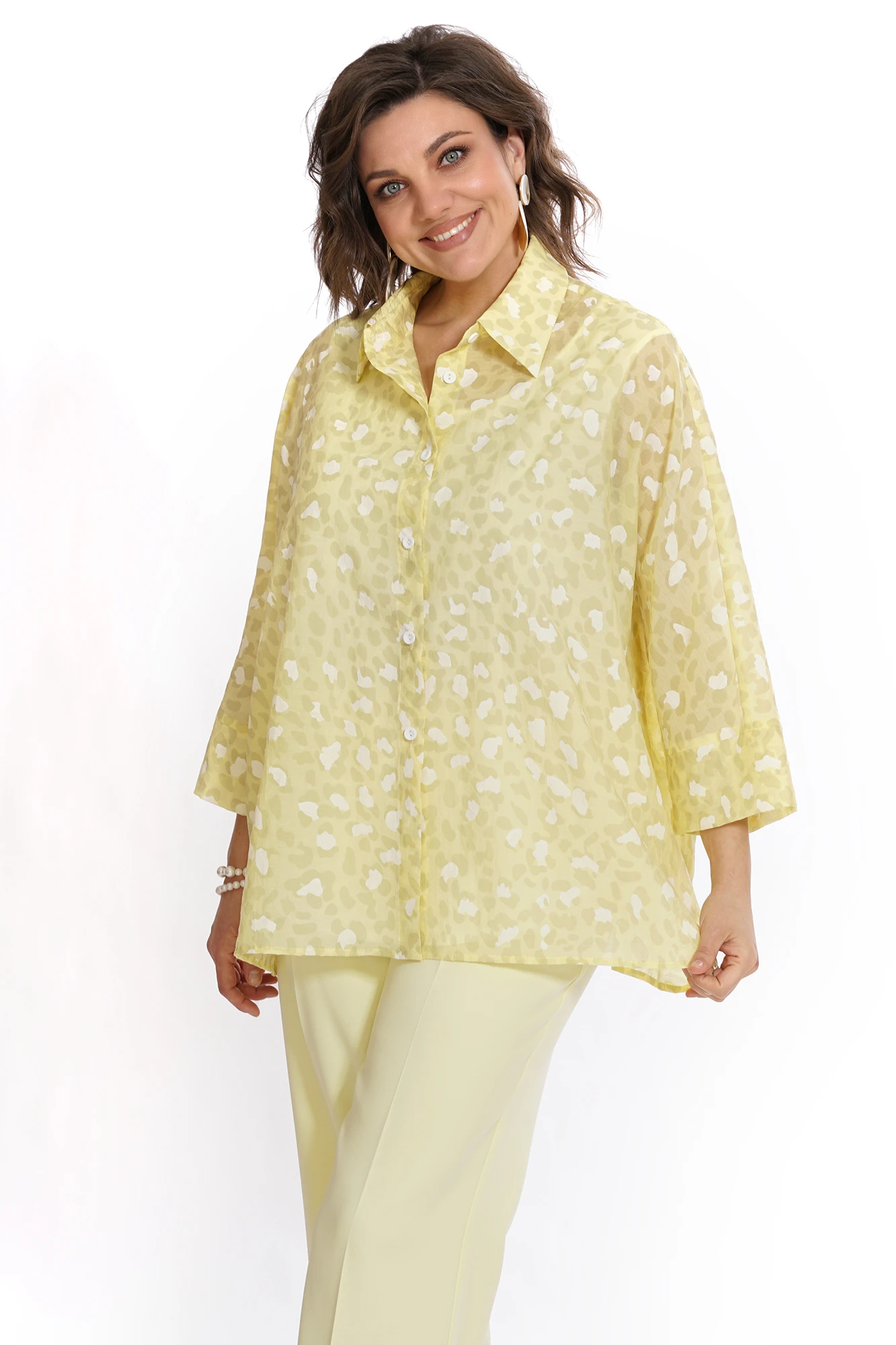 Ткань: Блузон платьево-блузочного ассортимента 62%вискоза, 25%нейлон, 14%полиэстер; Блуза платьево-блузочного ассортимента 73%П/Э, 21%вискоза, 6%спандекс; Брюки платьево-костюмного ассортимента 65%П/Э, 33%вискоза, 2%спандекс