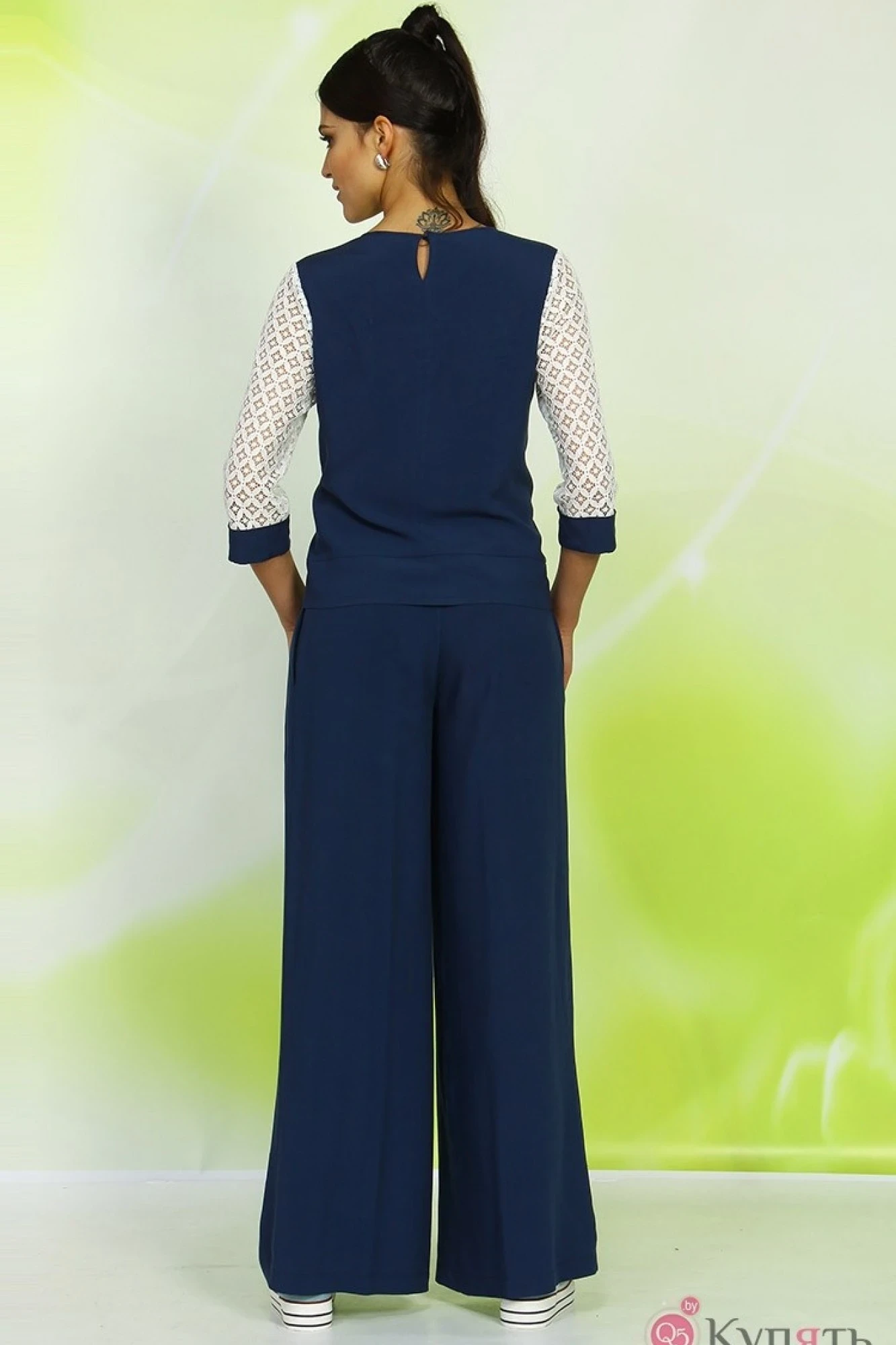 Комплект выполнен из летней хлопковой ткани (штапель), трикотажной вискозы и гипюра. Комплект состоит из блузы и юбки-брюк. Блузон выполнен из 3-х видов ткани. Блузон свободного силуэта, рукав втачной, нижняя часть на манжете. Полочка на кокетке, на центральной втачной детали выполнена печать. Быковые полочки с фигурным низом в виде выступающих углов. Спинка со средним швом на застежке на навесной петельке и пуговичке. Юбка-брюки длинные, свободного силуэта, на притачном поясе, застежка-молния на боковом шве. По поясе две пришивные пуговички на петли пробивные. Передние полотнища брюк с заложенными к центру мягкими складками.