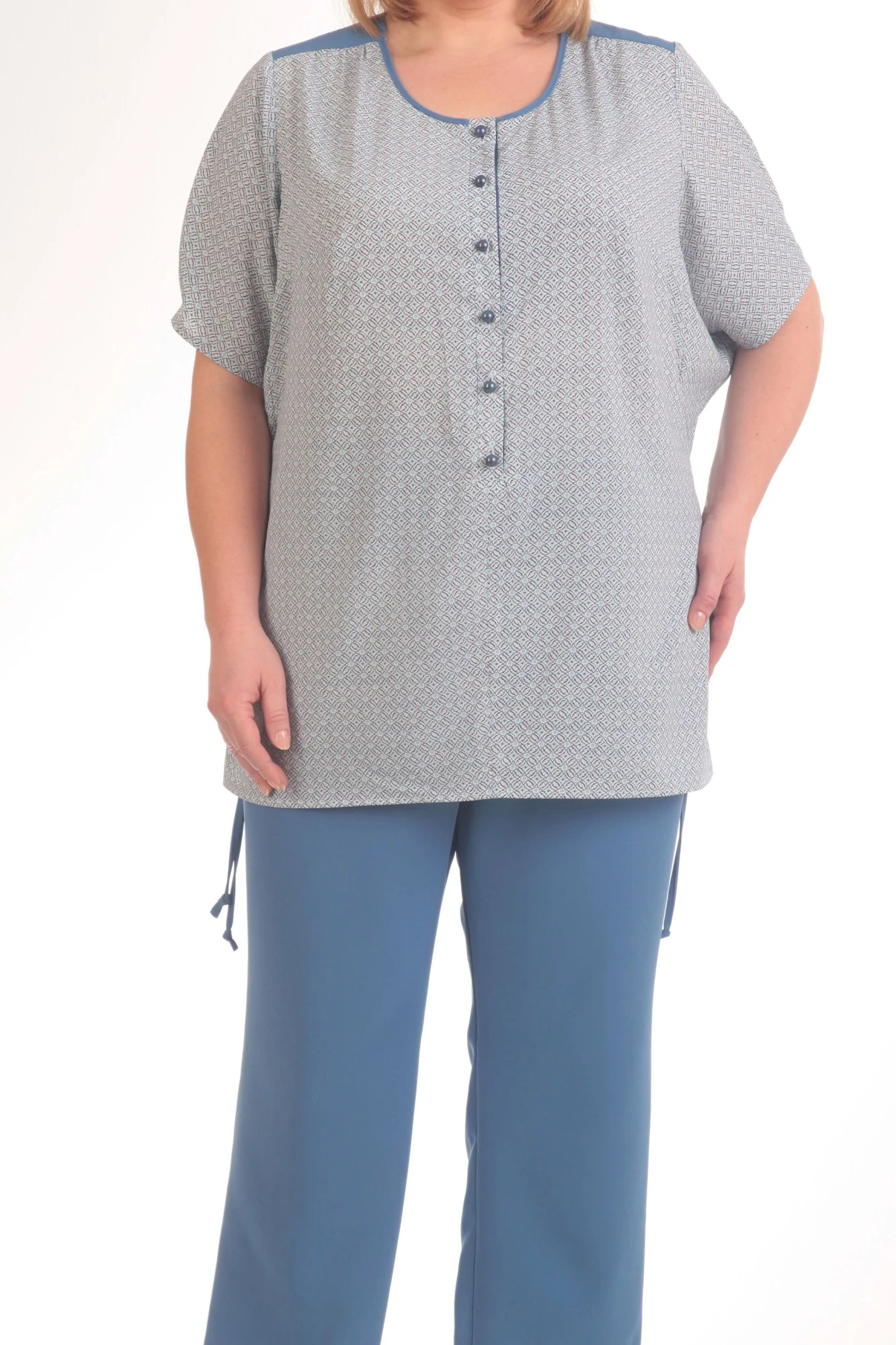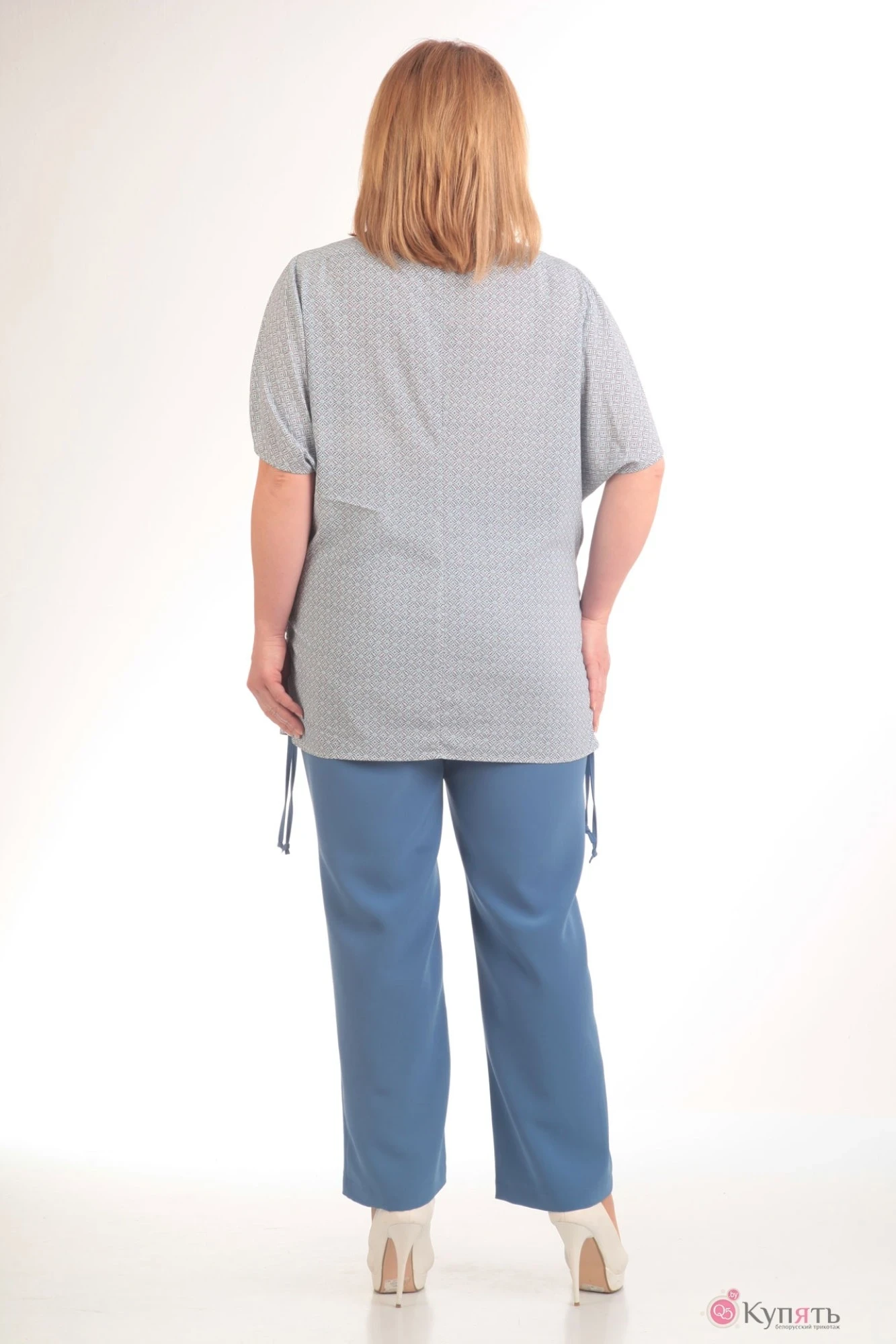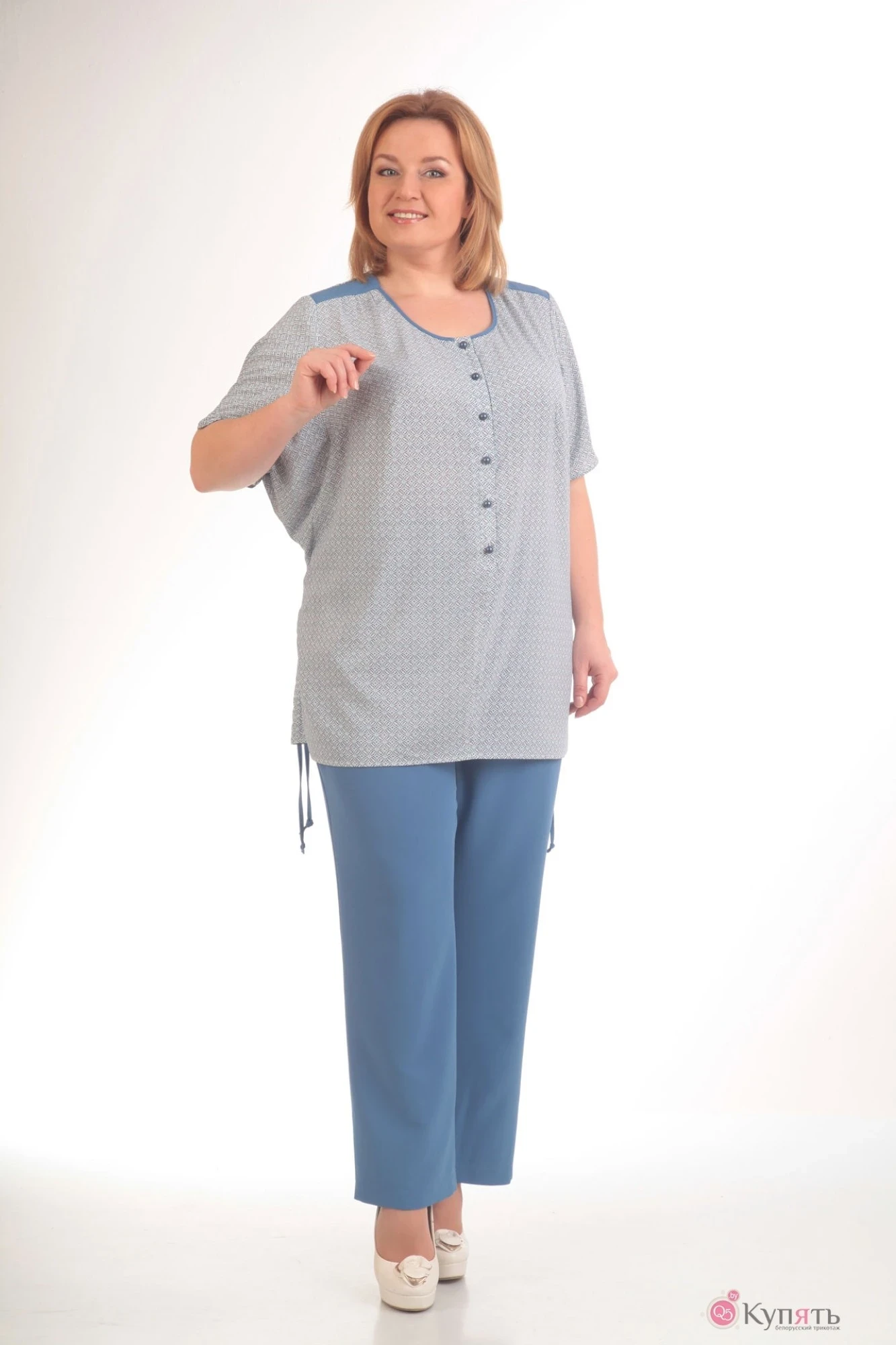 Костюм летний,состоит из блузы и брюк. Блуза прямого силуэта с планкой застежкой на петли пуговицы.Горловина с окантовкой.В боковых швах--кулиса.Спинка со средним швом и кокеткой. Рукава втачные с имитацией "летучая мышь".По низу рукава-встречная складка. Брюки прямые,с застежкой на молнию с приточным поясом с резинкой.На передней части карманы с листочкой.