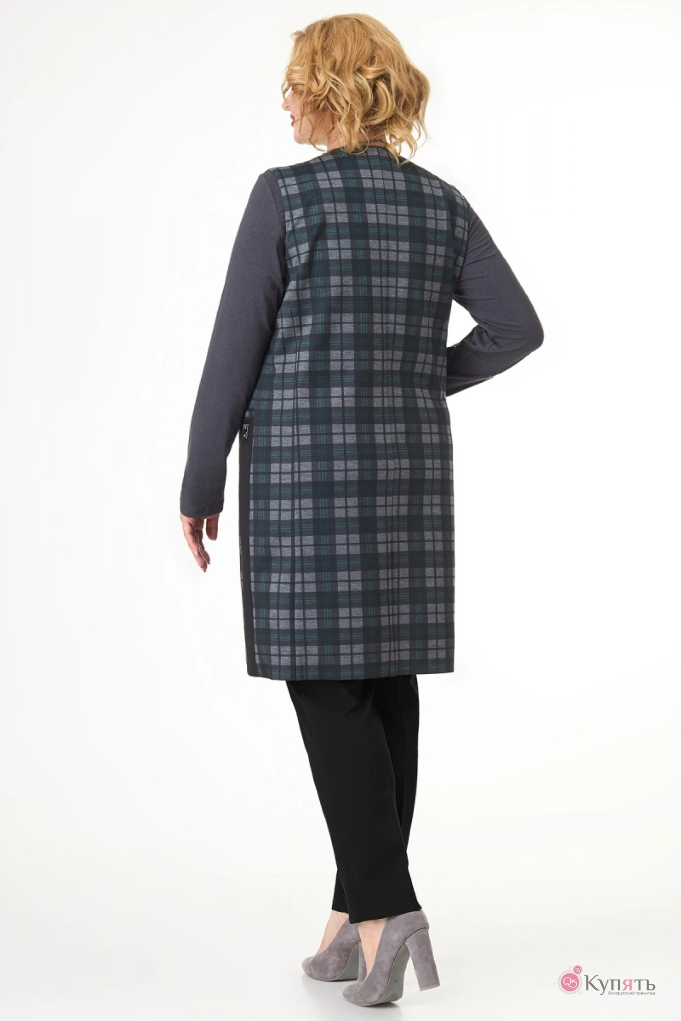 Модель в стиле casual – многослойность, простота силуэта и непринужденность сочетаний. Удлиненный жилет прямого кроя подойдет женщинам с любой фигурой, главное его преимущество – это способность стройнить и вытягивать силуэт. Линию борта поддерживает однотонная вставка с декоративной застежкой в виде ремешка. Плечевой пояс оформлен кокетками, игра клетки и наклонные вытачки придают легкую динамичность образу. Функциональные карманы в листочку, однотонные вставки в боковых швах и модный логотип смотрится очень стильно и практично.