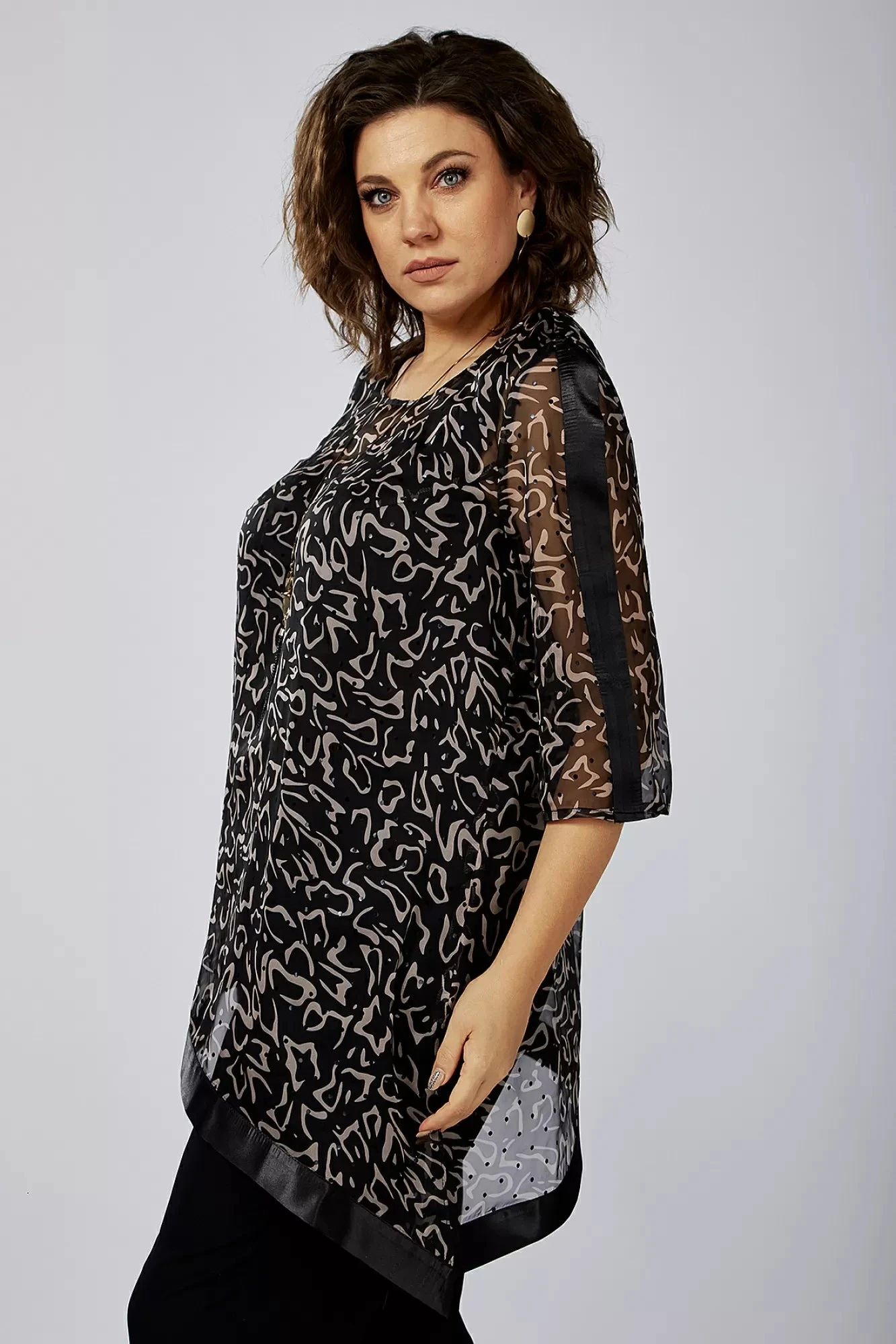 Мягкий, красивый стильный и очень комфортный женский костюм большого размера, состоящий из блузы и брюк прямого силуэта. Брюки выполнены из непрозрачного шифона, пояс на резинке. Блуза выполнена из сетки. Блуза сложного геометрического кроя с удлиненным боковым швом и разрезом . Низ изделия обработан отделочной тканью. Рукава длинной чуть ниже локтя.Необычное дизайнерское решение на стыке безупречной женственности и стиля с динамикой и новаторством подчеркнет изысканный вкус обладательницы, не лишив комфорта и функциональности. Пойдет как офисная одежда, а так же как вечерний наряд, как праздничный для вечернего выхода. В больших размерах легкий оверсайз.