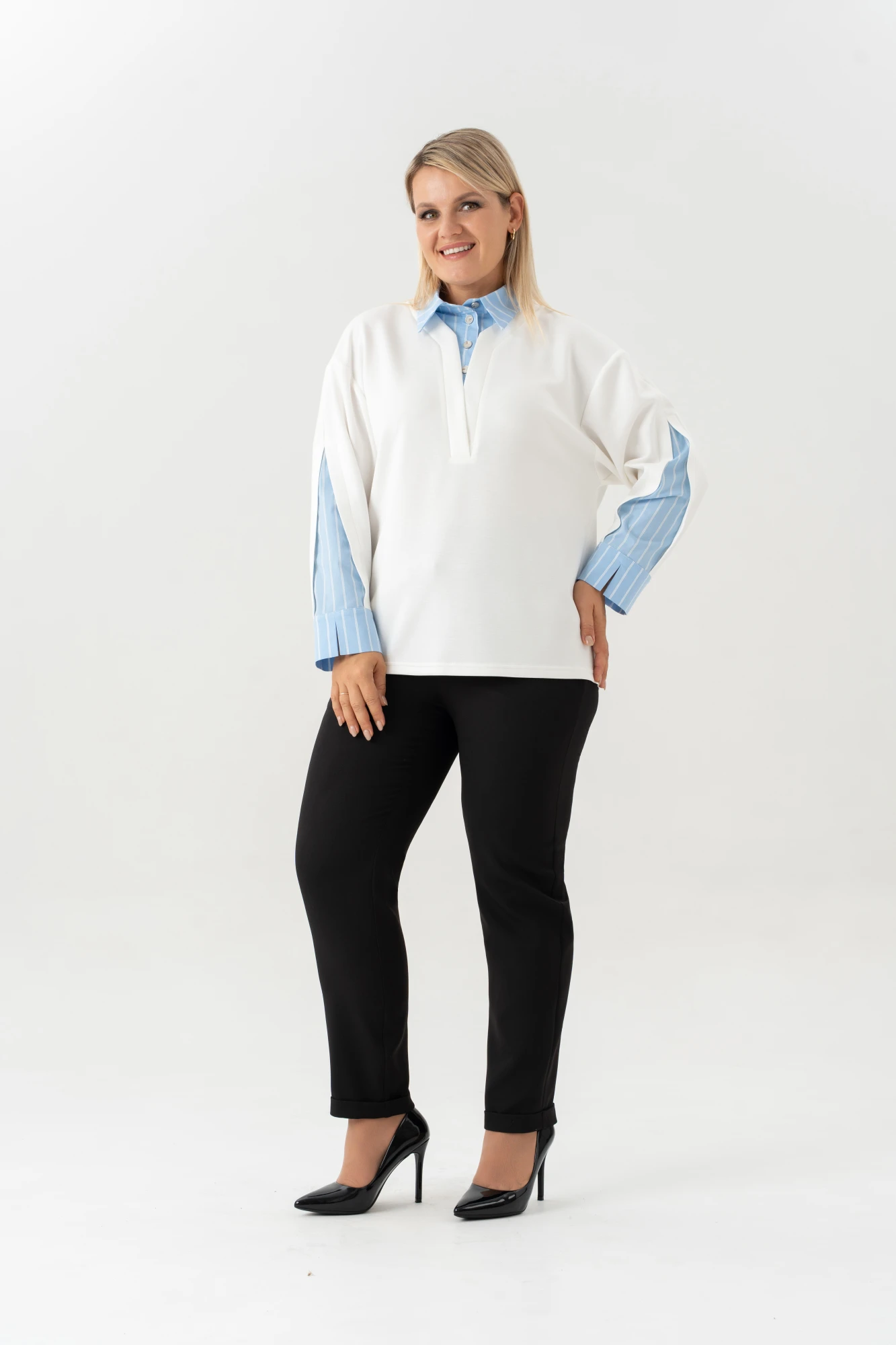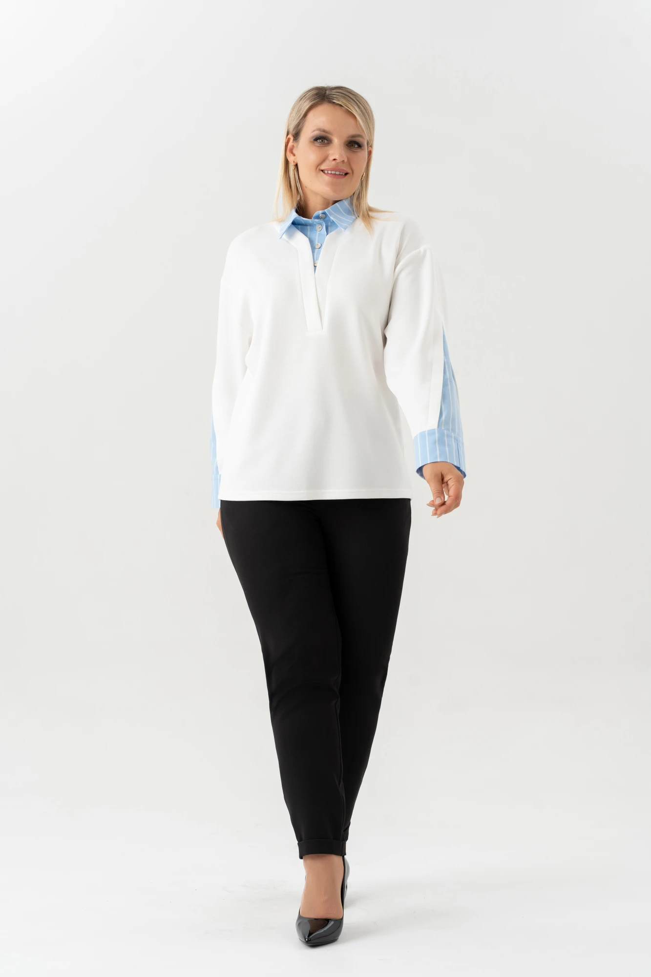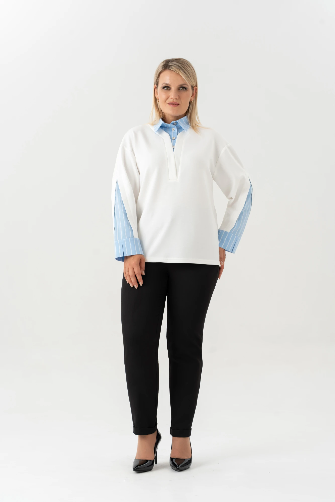 Практичный и удобный – он станет Вашим любимым костюмом, а трендовый дизайн делает его актуальным решением для девушек, которые следят за модой. Свитшот женский с имитацией рубашки- новинка коллекции. Изготовленный из качественного трикотажа и полоски на х/б основе, он обеспечивает дышащие свойства и гипоаллергенность, что особенно важно для женщин с чувствительной кожей. Подходит на осень, весну и для зимы. Ткань необычайно мягкая и приятная к телу. Свободный оверсайз крой изумительно подойдет для девушек и женщин больших размеров. На свитшоте обработан воротник и застежка –планка на петли и пуговицы. Рукав комбинирован из двух тканей, с манжетой и разрезом. Модель подходит для высоких и для невысоких. Брюки с удобной ,высокой посадкой и боковыми карманами позволяют хранить мелкие вещи, такие как ключи или смартфон, что делает этот костюм не только стильным, но и практичным. По низу брюк обработаны манжеты. Пояс частично на резинке, застежка на молнию и петлю с пуговицей.