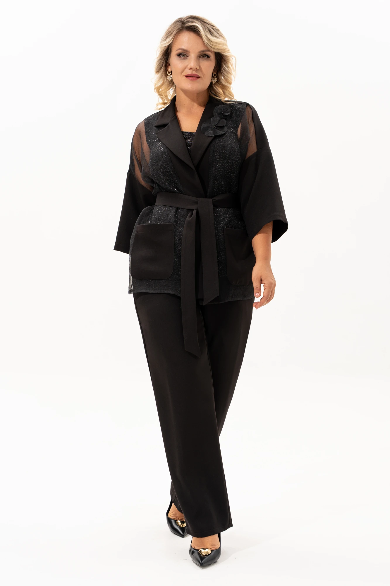 Невероятно стильный и изысканный комплект состоит из элегантного жакета кимоно и брюк. Он сочетает в себе стиль кимоно с классическими чертами жакета, создавая запоминающейся эффект. Комплект трехпредметный из костюмной ткани "батби"и органзы понравится всем женщинам, любящим комфорт и индивидуальность . Брюки "палацо" визуально удлиняют ноги, благодаря высокой посадке, длине макси и прямому фасону. Широкая резинка на талии не пережимает тело, а свободный покрой брюк корректирует силуэт и пропорции полной фигуры. Верх представлен в виде блузы и жакета. Блуза выполнена из ткани "масло" с пайетками. Блуза изготовлена из мягкой, приятной к телу ткани с пайетками, ткань не колется, приятная к телу. Жакет скомбинирован из двух тканей- барби и органзы, что делает изюминку в этом шикарном брючном комплекте. Прочный, мягкий и несминаемый комплект выглядит красиво, делая образ женственным , соблазнительным . Жакет без застежки, с функциональными карманами и спущенным плечом. Пояс, входящий в комплект, позволяет акцентировать талию и придать жакету дополнительный шик. Свободный крой жакета придаёт ему особую изысканность, идеально подобранные строчки делают его ещё более эффектным. Жакет оснащён аккуратным английским воротником . Лацкан украшен съемной бошью в виде цветка из органзы. Удобно, что модель 3 в 1 можно носить не только единым ансамблем, но и по отдельности, комбинируя с другими предметами. Многослойность сегодня – популярный тренд моды. Это позволяет женщинам экспериментировать и создавать множество стильных аутфитов на свой вкус. Такая элегантная нарядка впишется в любое мероприятие: начиная от свадьбы, дня рождения, романтического свидания, заканчивая новогодней вечеринкой.