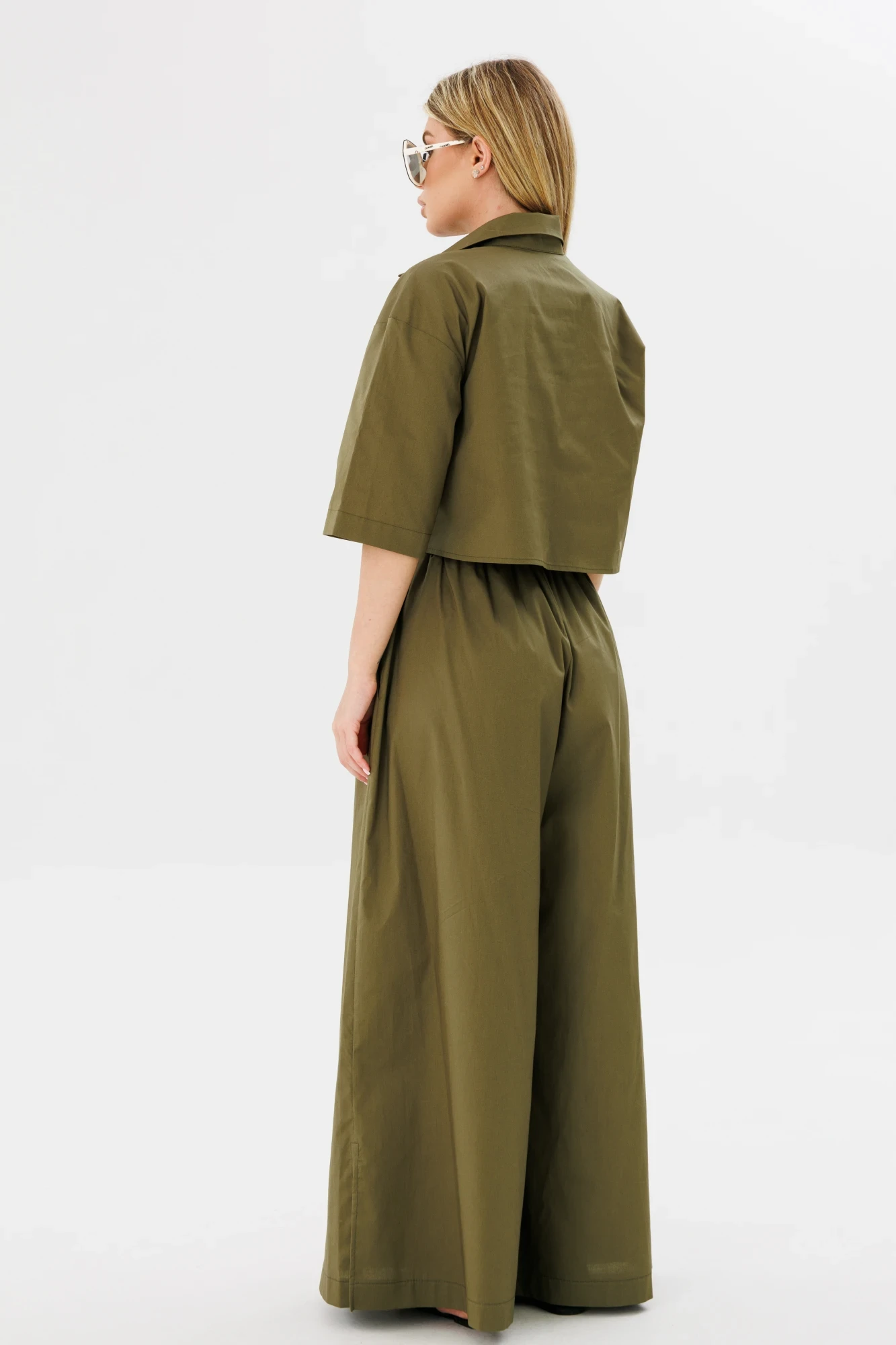 Рубашка укороченная, свободного силуэта,с центрально бортовой застежкой на петли пуговицы.Воротник на стойке отложной,рукав короткий.Юбка-Брюки свободного силуэта.Пояс на резинке.По низу брюк в боковых швах разрезы.