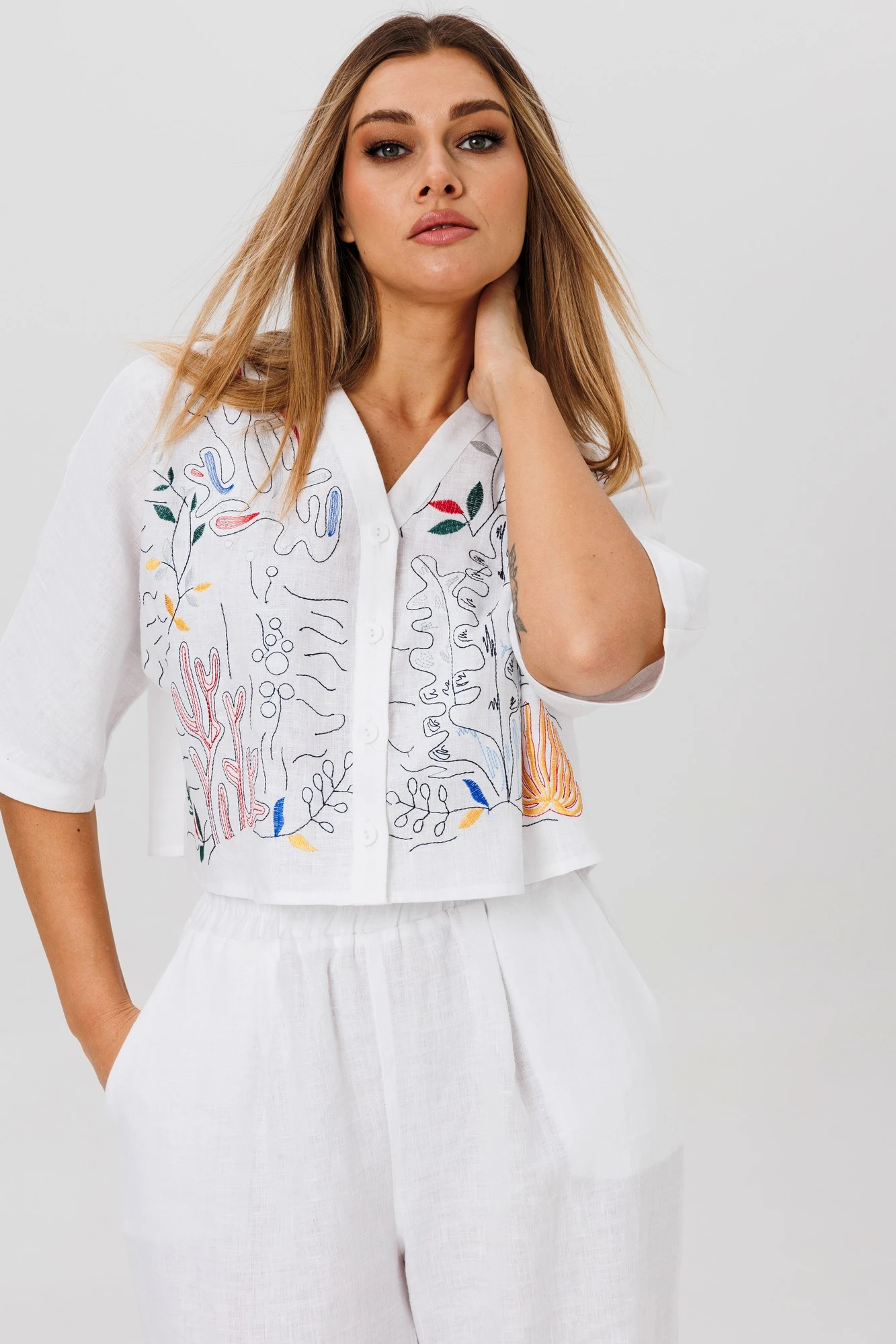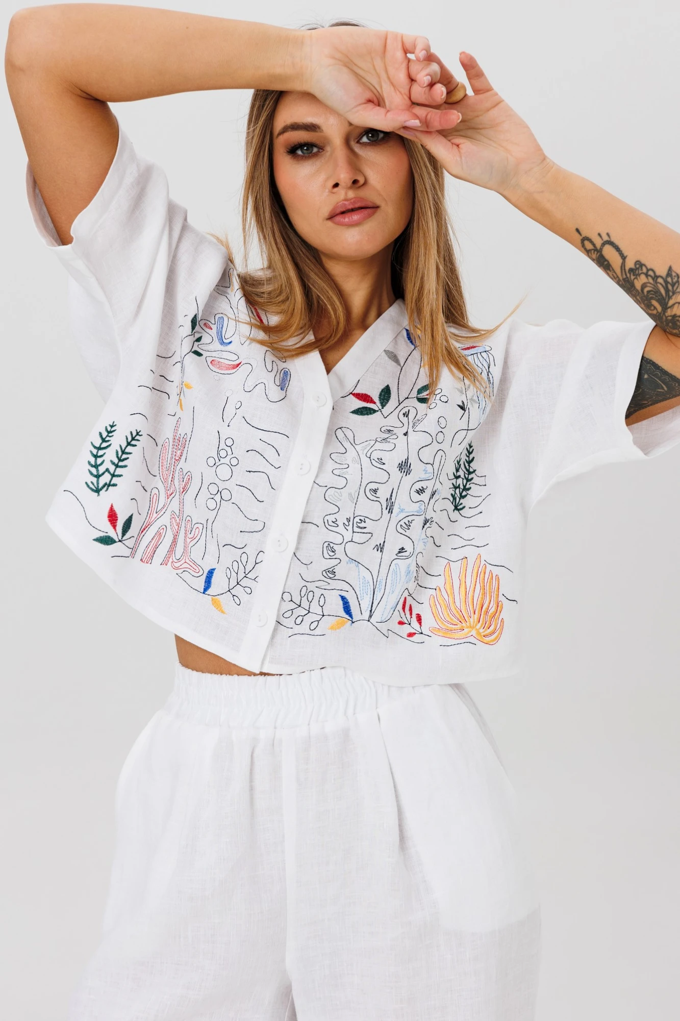 Рубашка укороченная свободного силуэта. Застежка центральная на петли и пуговицы. На полочке декоративная дизайнерская вышивка. Рукав полуреглан длиной до локтя. Спинка цельная.