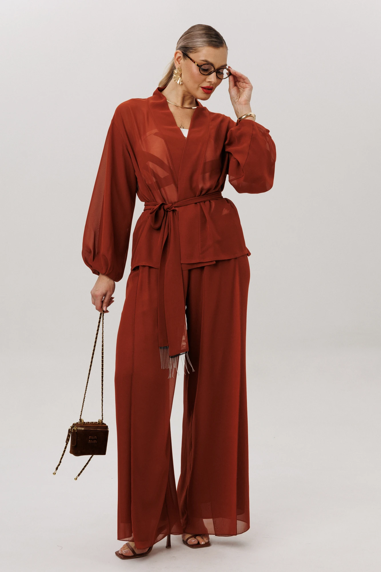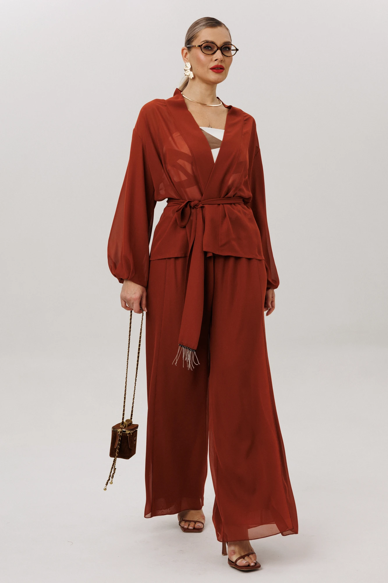 Элегантный вечерний костюм-двойка из шифона, состоящий из блузки свободного кроя и широких брюк. Красивый и эффектный брючный костюм - это идеальный образ для особых случаев, вечерних выходов, праздничных и торжественных мероприятий, будь то корпоратив, свадьба, юбилей, выпускной, день рождения, Новый год Блузка прямого силуэта из шифона со пущенной линией плеча. Рукав двойной, расширенный к низу со складками. По спинке и полочке идет планка. В комплекте с блузкой идет съемный пояс. На концах пояса металлизированная бахрома. Брюки прямые на трикотажной подкладке масло, с запахом по переду, пояс на резинке.Благодаря фасону и крою, костюм визуально вытянет силуэт, сделает фигуру стройнее, подчеркнет ее достоинства, скроет недостатки. Элегантный брючный костюм от Anastasia- комфорт и уверенность в себе на любом мероприятии