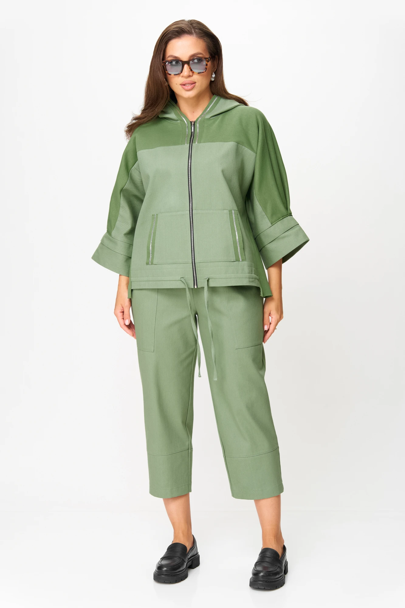 Оригинальный комплект женский 2-х пердментый (кофта -зипка и брюки) из двух видов ткани: верх- трикотажное полотно и джинс, брюки-джинсовое полотно от бренда Anastasia, идеальный для любого случая. Этот костюм сочетает в себе элегантность и комфорт, что делает его подходящим как для повседновной носки, так и для праздничных мероприятий. Нежный и теплый материал делает его отличным выбором для осенне-зимнего периода, при этом он легкий, поэтому его можно носить и в прохладную погоду летом . Кофта оверсайз на молнии с капюшоном прямого силуэта. Рукав 3/4 длиный с двойной манжетой. По полочке идут накладные карманы, по низу -кулиска. В качестве декора по капюшону и накладным карманам - отделочная тесьма. Брюки -бананы 7/8 , пояс на резинке. По передней и задней половинкам идет отрезная кокетка и по низу брюк- подрезы. Карманы накладные спереди.Плотная, натуральная джинсовая ткань визуально скрывает любые недостатки. Отдельный части костюма легко будут сочетаться с вещами из Вашего гардероба. Модель можно отнести к стилю спортивный кэжуал, оверсайз, спортивный шик. Костюм можно носить с босоножками, кроссовками, высокими сапогами или ботинками Хороших покупок от «Анастасия». Длина кофты (по спинке):(50-54)- 62см, (56-60)-66 см. Длина рукава с манжетой: (50-54)-55см, (56-60)-57 см. Длина брюк: (50-54)-87 см, (56-60)-89 см