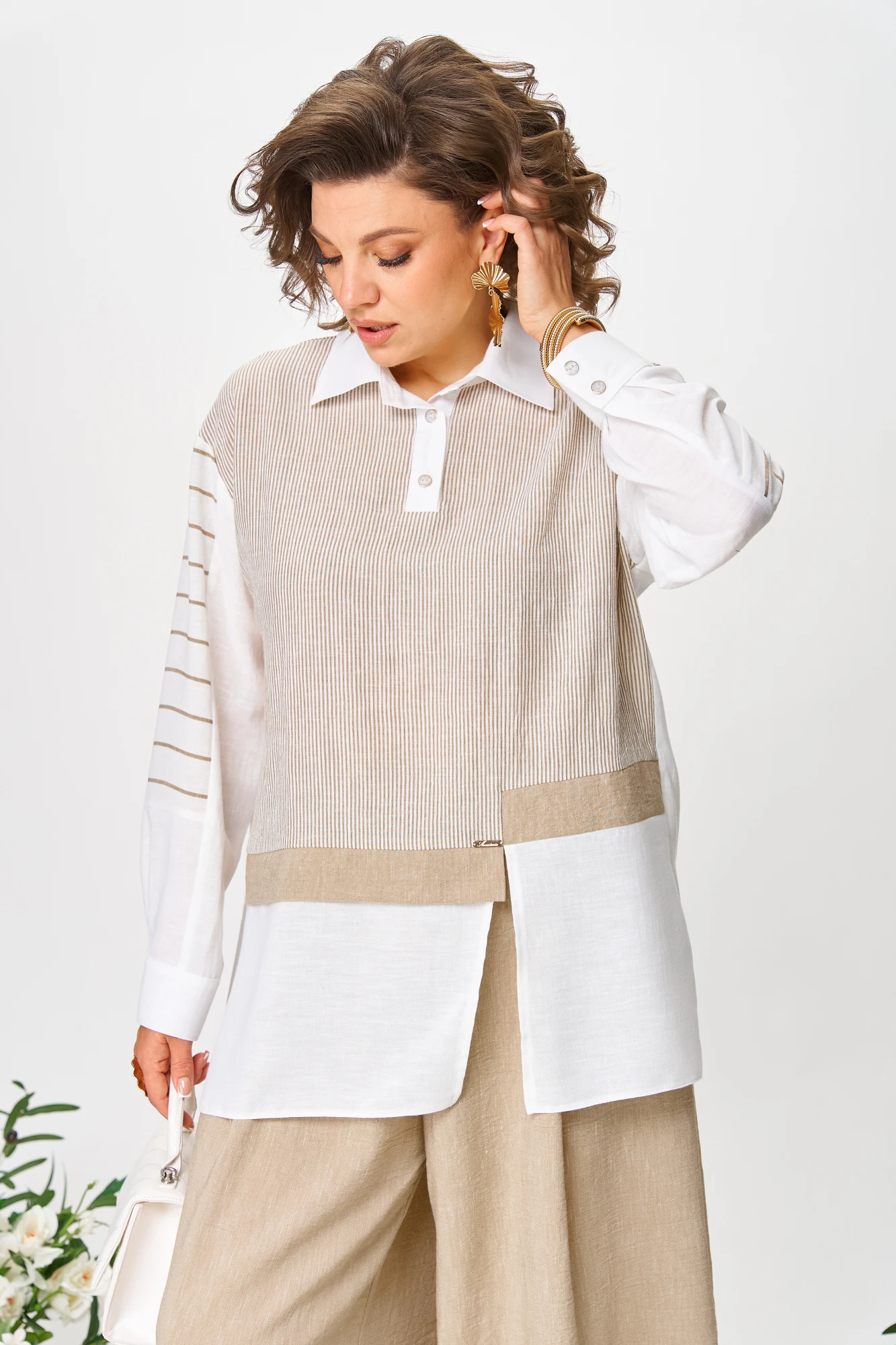 Комплект создан для тех, кто ценит комфорт и элегантность в каждой детали. В комплект входит блузка и штаны палаццо. Оверсайз крой придаёт костюму особый шарм, а легкая невесомая ткань дает свободу движений. Высокая посадка и резинка по поясу подчёркивает талию и делает силуэт более изящным. Смесь натуральных материалов позволяет пропускать воздух и отводить влагу, что особенно важно в жаркую погоду и прохладное утро. Ткань не мнется. Благодаря свободному крою костюм подойдёт для разных типов фигуры. Он подчеркнёт вашу индивидуальность и станет отличным дополнением к вашему летнему гардеробу. Этот брючный костюм — не просто одежда, это заявление о вашем стиле и вкусе. В нём вы будете чувствовать себя уверенно и комфортно, зная, что выглядите на все сто. Выбирая этот костюм, вы выбираете качество, комфорт и стиль. Выберите льняной костюм и наслаждайтесь летом в полной мере!Блузка прямого силуэта, застежка на планку и пуговицы. Воротник на отрезной стойке. По полочке идет ассиметричный подрез со вставками из 2-х видов однотона и разрезом. Плечо спущенное, рукав длинный со вставками из ткани в полоску, на манжете. По спинке идет кокетка из ткани в полоску и встречная складка. Брюки полаццо прямые с односторонней складкой и запахом по центру. По низу брюк широкая подгибка.Пояс на резинке . В качестве декора- брендированная металлическая нашивка по подрезу полочки. Длина по спинке (50-54) - 74 см, (56-60) - 76 см. Длина рукава (с манжетой): (50-54) - 57 см, (56-60)-59см. Длина брюк: (50-54) - 98 см, (56-60) - 99 см
