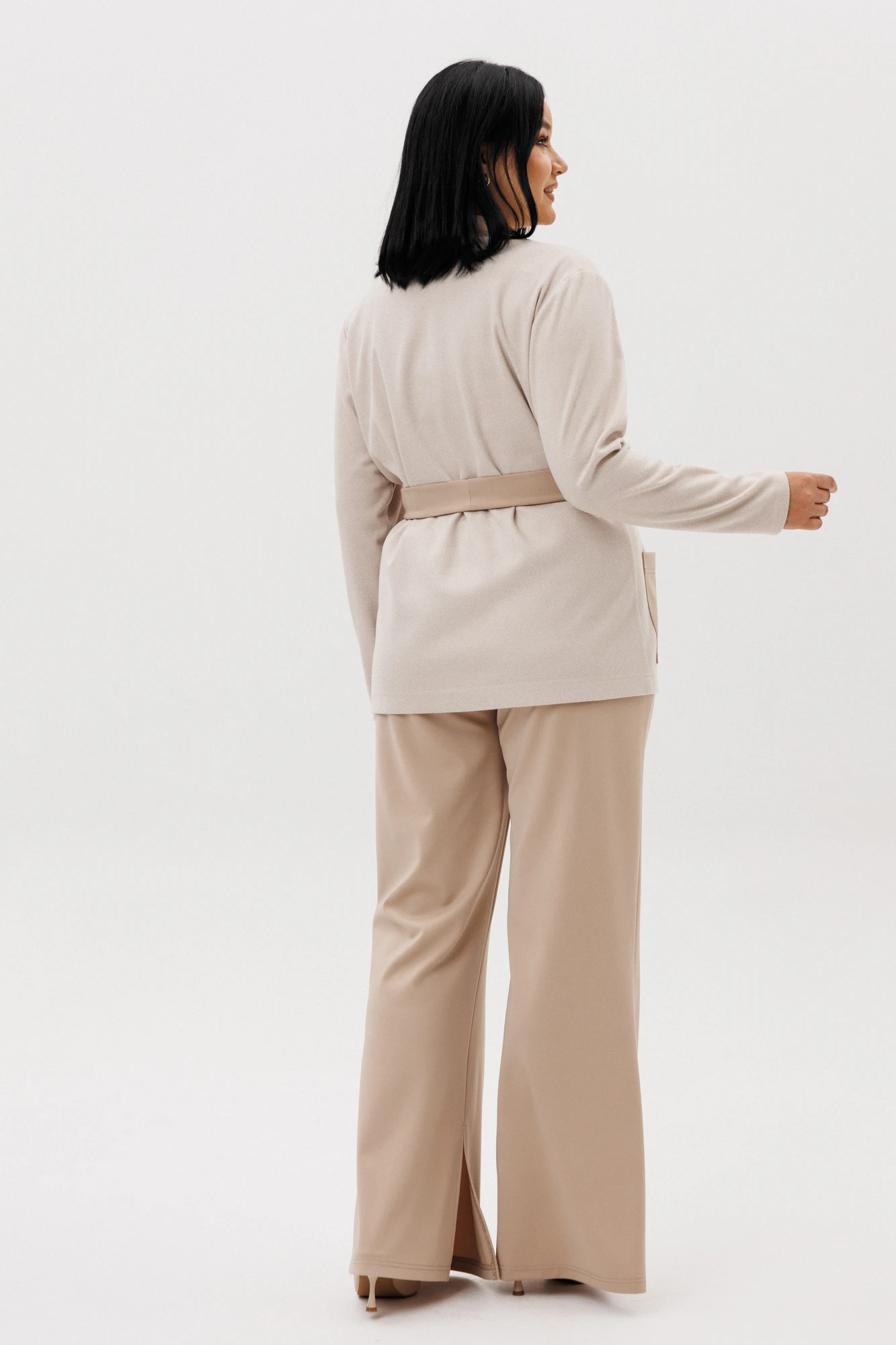 Нежный и комфортный женский комплект в стиле Old money от бренда Anastasia, идеальный для любого случая. Этот комплект сочетает в себе элегантность и комфорт, что делает его подходящим как для деловых встреч или прогулок. Комплект состоит из жакета и брюк. Жакет прямого силуэта. Застежка- планка с пуговицами. По полочке идут накладные карманы. Рукав втачной, одношовный. Подчеркнуть талию можно съемным поясом. В качестве декора- брендированная нашивка на кармане, перекликающаяся с золотыми пуговицами. Стильный комплект отлично подойдет для долгих прогулок или для работы, для офиса. Брюки -клеш, пояс на резинке. По внутреннему срезу по низу идут разрезы. Отдельный части костюма легко будут сочетаться с вещами из Вашего гардероба. Модель можно отнести к стилю кэжуал. Костюм можно носить с туфлями, кроссовками или ботинками. Обязательно добавьте наш бренд в избранное и следите за новинками, распродажами, скидками и акциями! Хороших покупок от «Анастасия». Длина (по спинке):(50-54)- 68см, (56-60)-71 см. Длина рукава: (50-60)- 60см. Длина брюк: (50-54):- 106см, (56-60)- 108см.