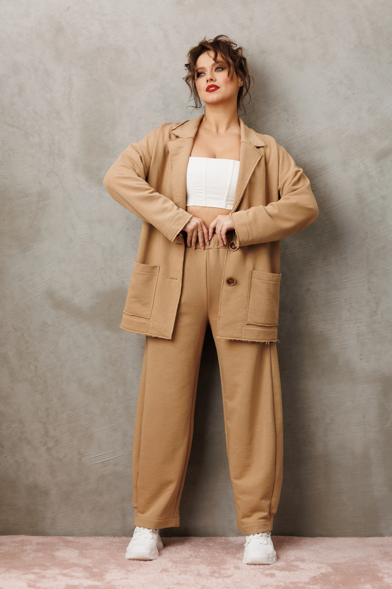 Костюм женский кэжуал (casual) из трикотажного материала трехнитка свободного кроя, который создает расслабленный силуэт -это отличный выбор для активных и стильных деушек и женщин, которые ценят моду и комфорт! Жакет со спущенным плечом. Воротник пиджачного типа, по полочке идут накладные карманы. Жакет без подкладки, мягкий и легкий. Края борта воротника, низов и карманов не обработаны. Застежка на петли и пуговицы. Выполнен в крое Oversize свободной формы и посадкой по фигуре. Если хотите силуэтную посадку, выбирайте на размер меньше. Если хотите посадку свободнее - заказывайте свой размер.