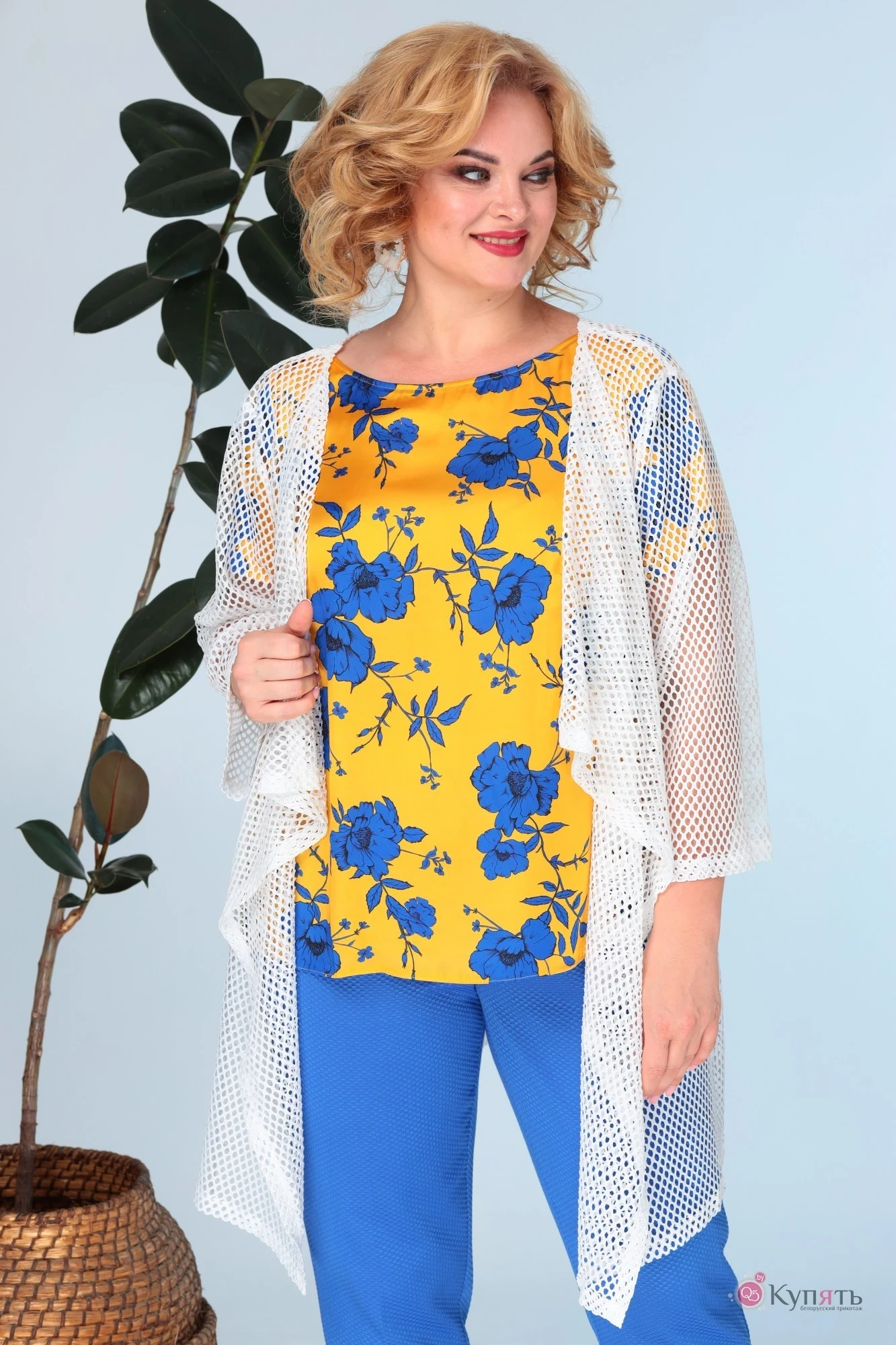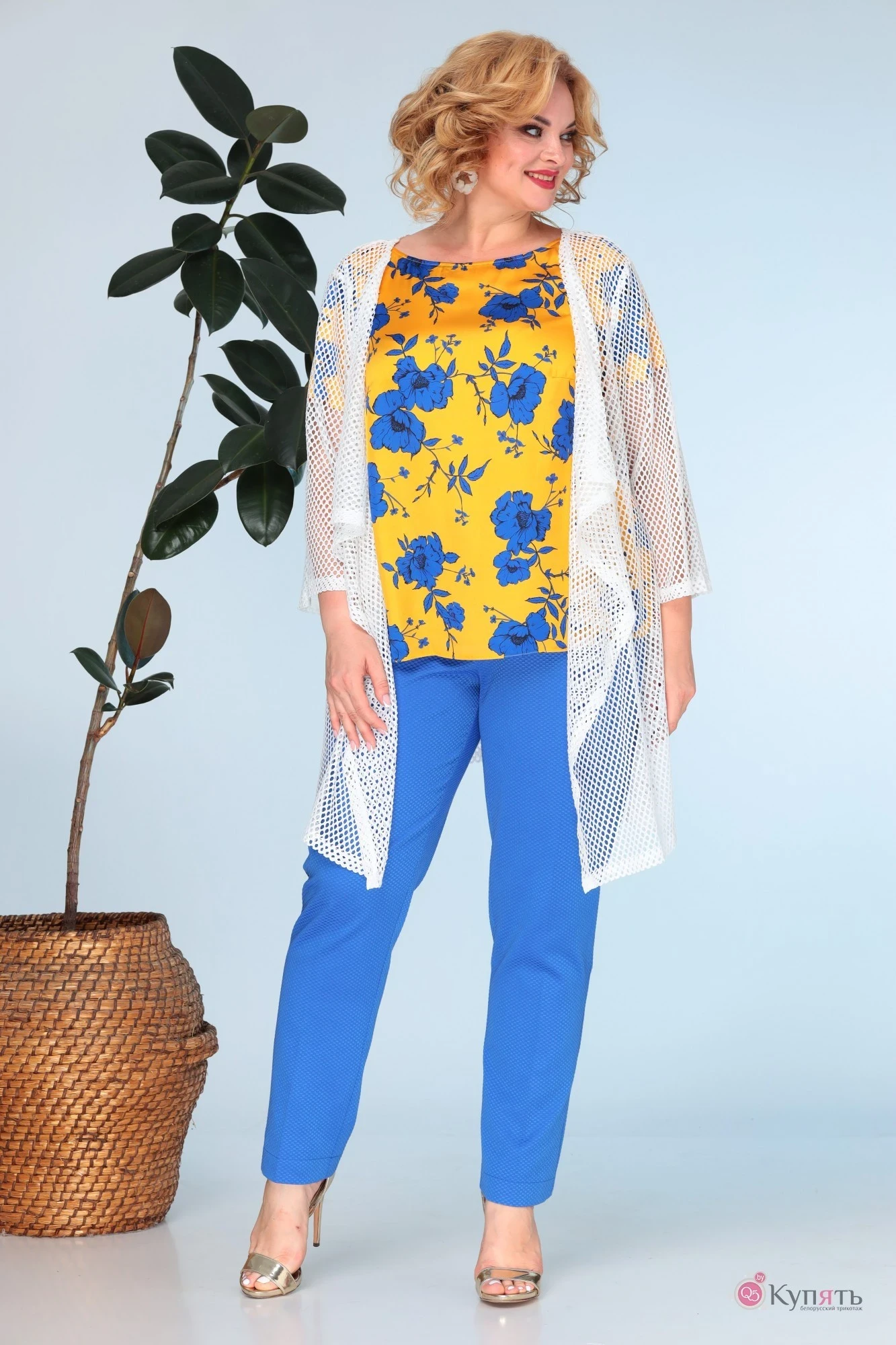 Брючный костюм Anastasia 591 молочный-ярко синий-светлая горчица тройка
