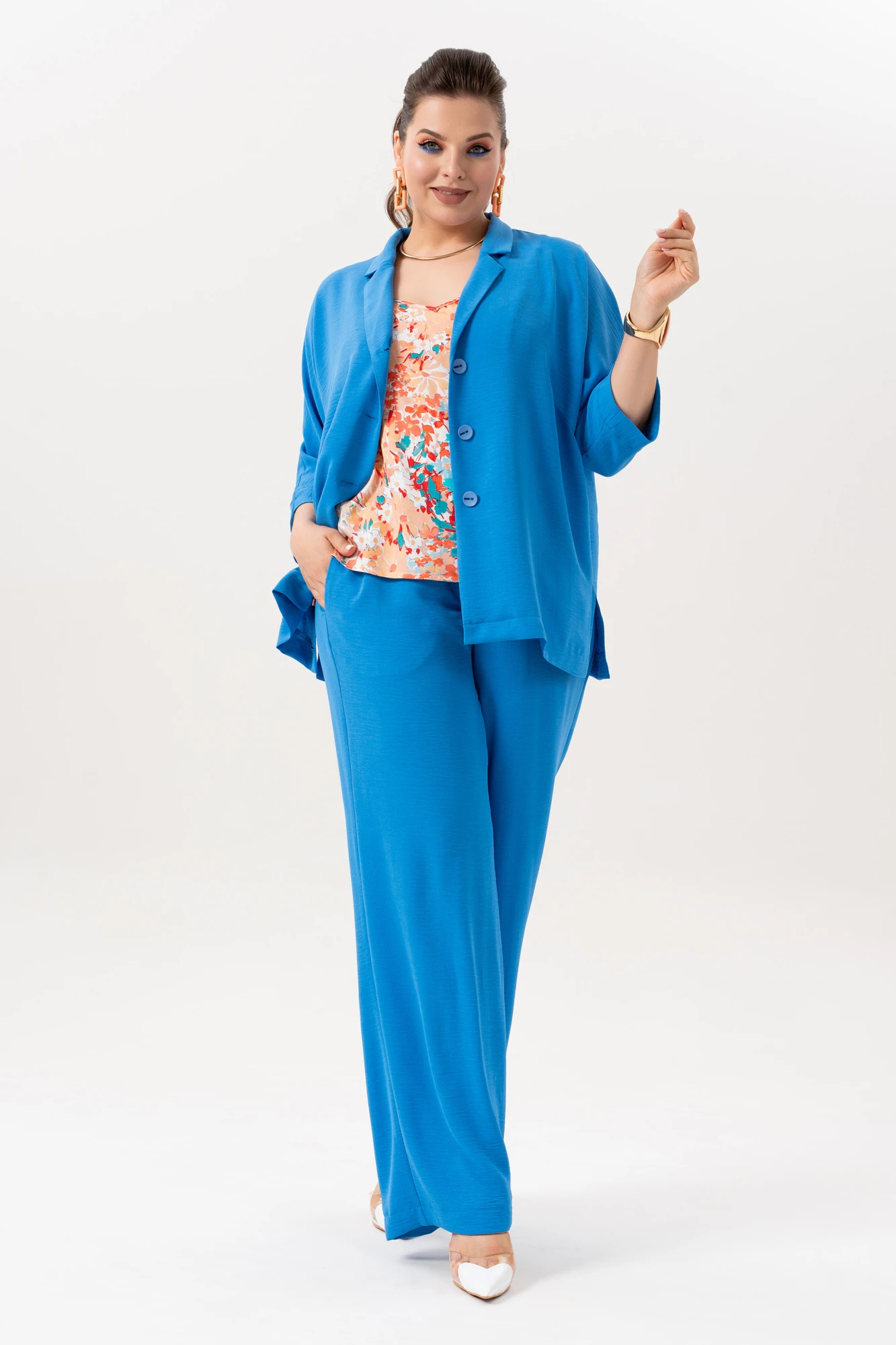 100%вискоза жакет+брюки:64% полиэстер, 34% вискоза, 2% спандекс