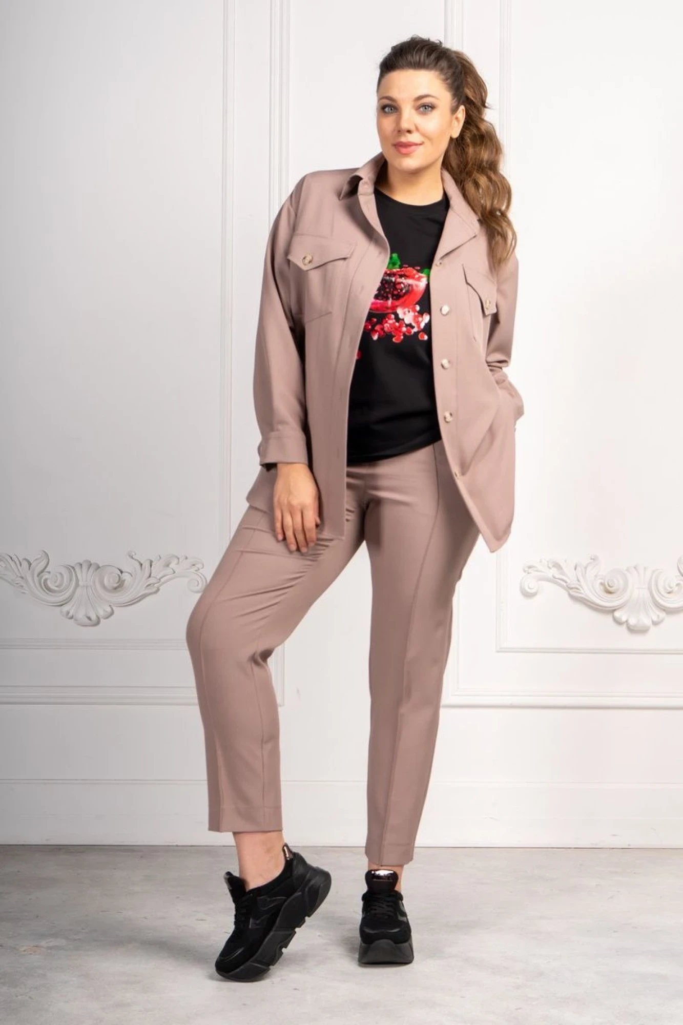 Комплект женский состоящий из блузки (рубашки) и брюк. Рубашка из мягкой ткани прямого силуэта с центральной бортовой застёжкой на петли и пуговицы, воронитк стояче-отложной, полочка с нагрудыми накладными карманами застёгивающиеся на петлю и пуговицу. Спинка с отрезной фигурной кокеткой, со складкой по центру. низ фигурный. рукава втачные двухшовные с притачной манжето застёгивающейся на петли и пуговицы. Брюки жеские полуприлегающего силуэта на притачной поясе,застёгивающимся на петлю и пуговицу, по переду с центральной застёжкой на тесьму-молнию. с боковыми наклонными карманами, с защипами по линии канта, по поясу спинки резинка.