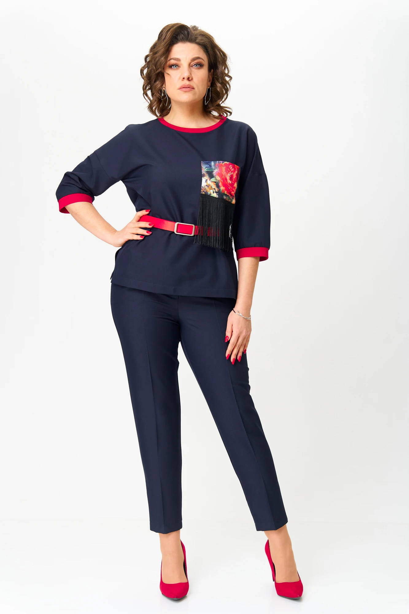 Блузка прямого силуэта со спущенной линией плеча, с рукавом длины 3/4. Горловина и низ рукава обработаны трикотажной бейкой контрастного цвета. По переду нагрудный карман из декоративной ткани с тесьмой с бахромой. В комплекте ремень.