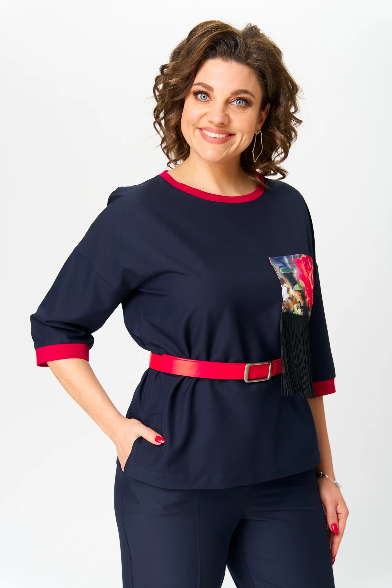 Блузка прямого силуэта со спущенной линией плеча, с рукавом длины 3/4. Горловина и низ рукава обработаны трикотажной бейкой контрастного цвета. По переду нагрудный карман из декоративной ткани с тесьмой с бахромой. В комплекте ремень.