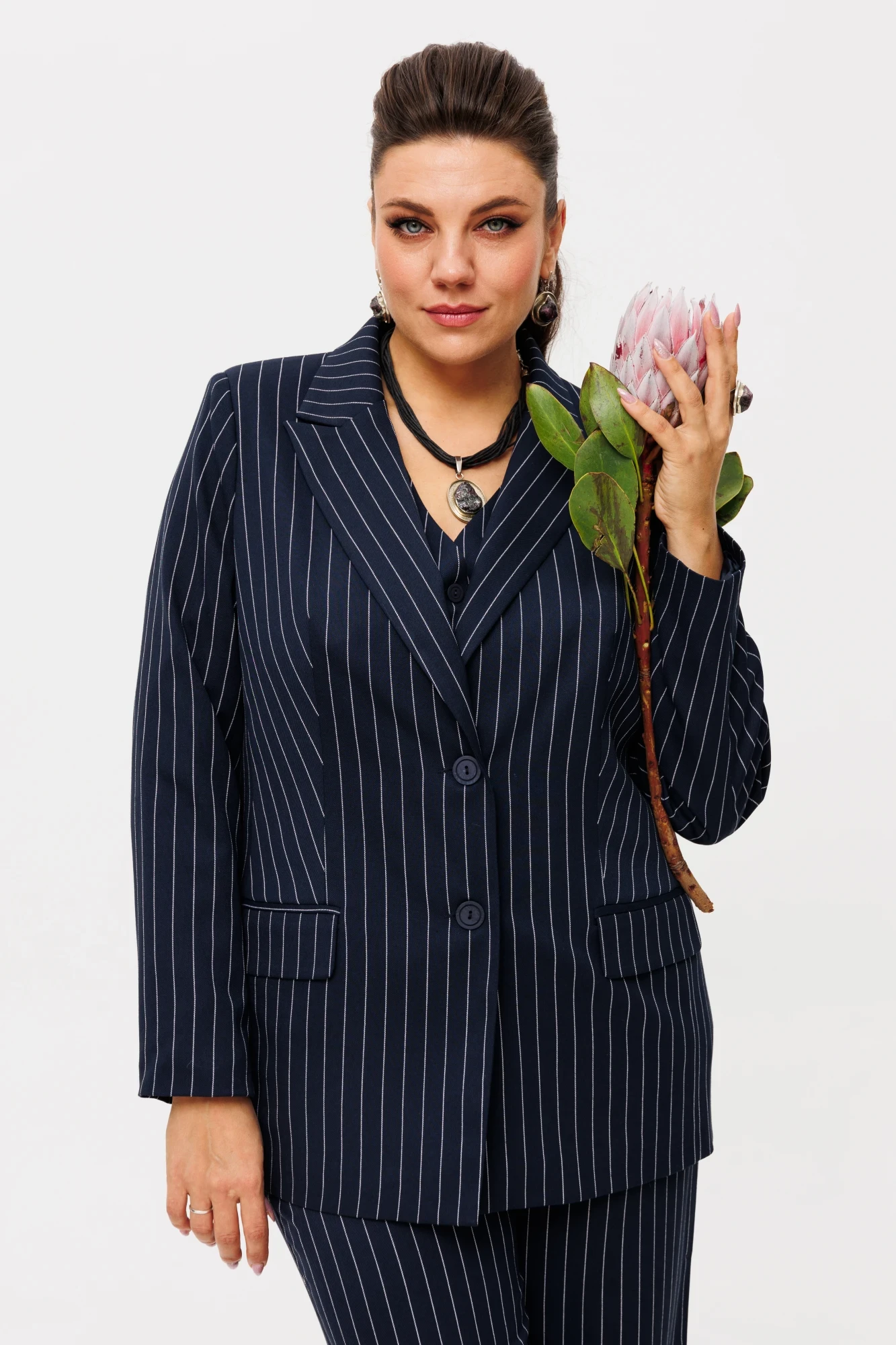 Этот костюм - это шик и универсальность. Жакет бойфренда сочетает в себе элегантность и комфорт, прямые брюки придают вам стройность и уверенность, а жилет завершает образ, добавляя нотку роскоши. Все это - актуальная классика, которая никогда не выйдет из моды.