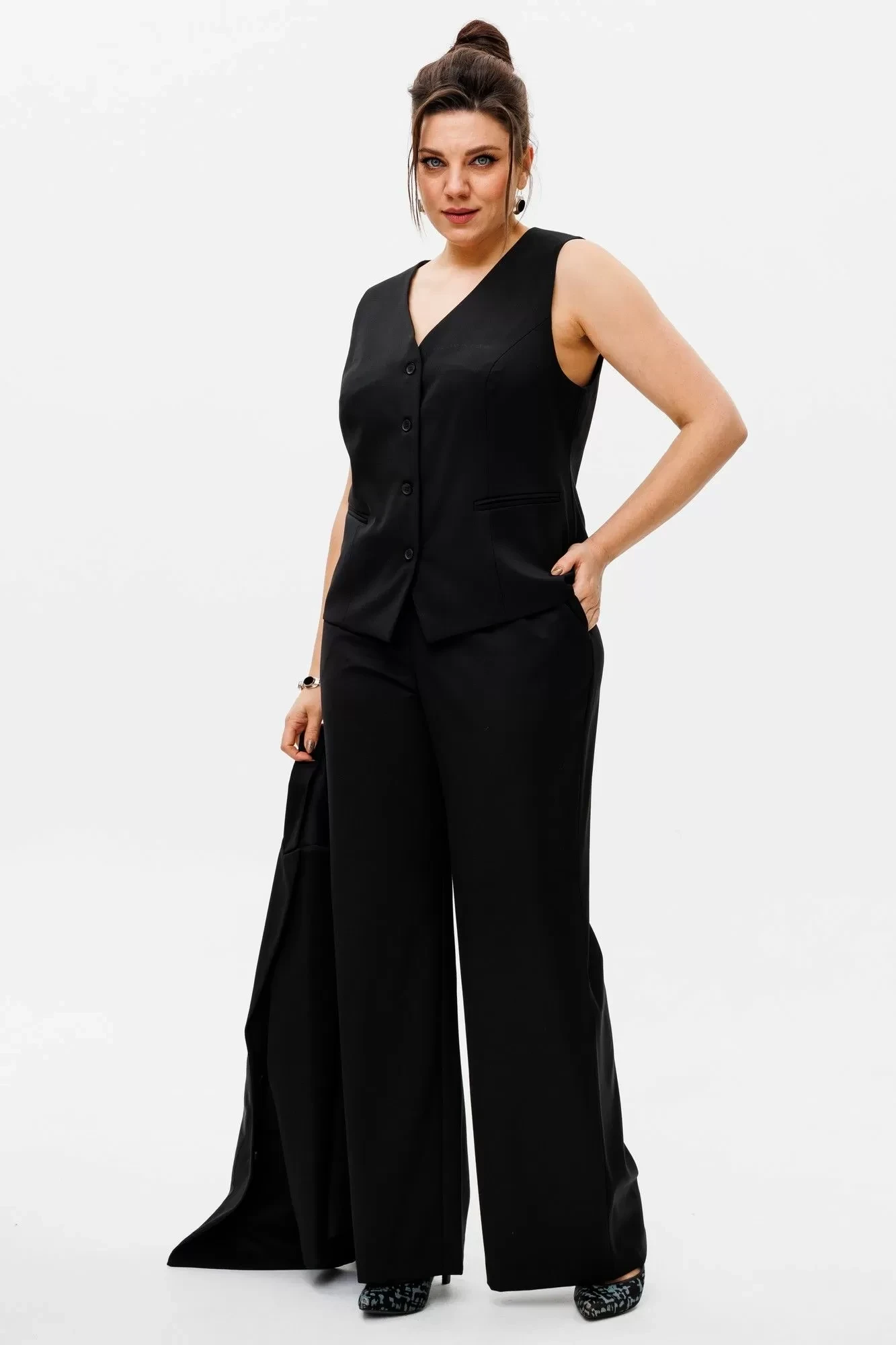 Этот костюм - это шик и универсальность. Жакет бойфренда сочетает в себе элегантность и комфорт, прямые брюки придают вам стройность и уверенность, а жилет завершает образ, добавляя нотку роскоши, брюки на резинке. Все это - актуальная классика, которая никогда не выйдет из моды.