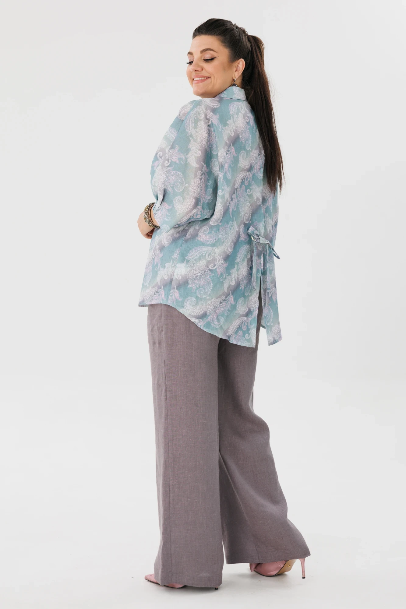 Крой рукава блузы - летучая мышь, низ рукава оформлен складочками. Распашная спинка закреплена игривыми завязками на люверсах.