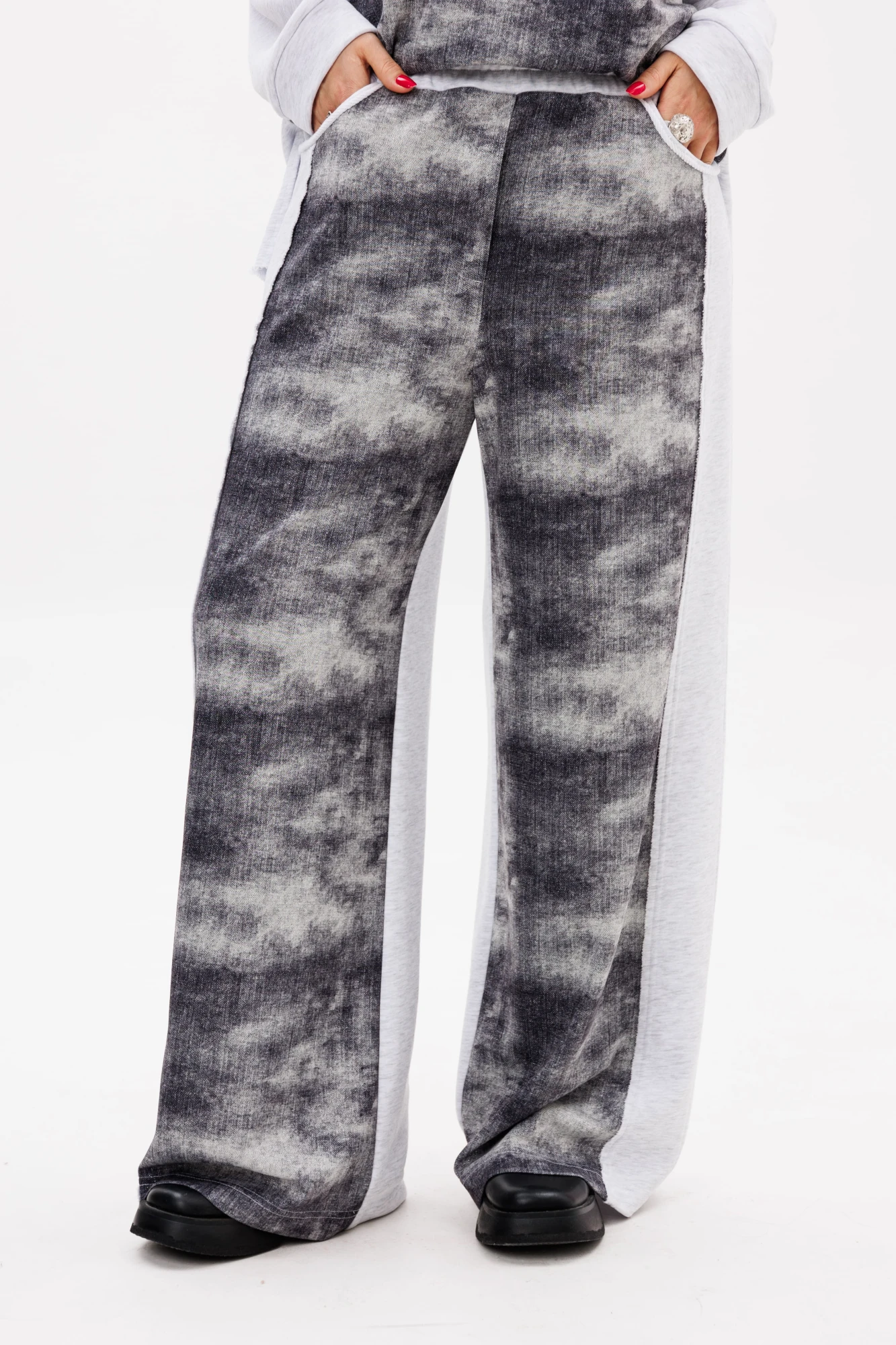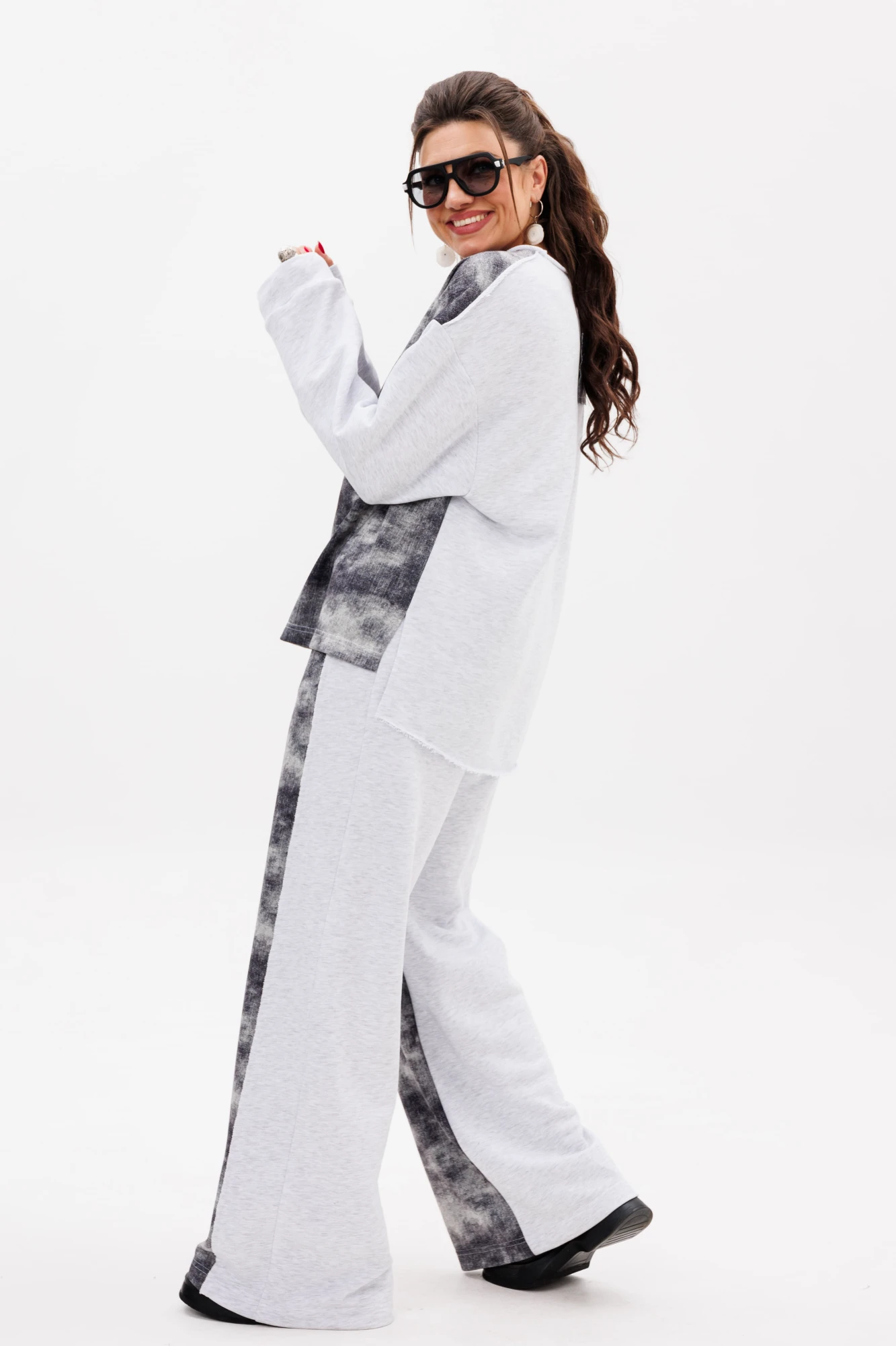 Свободный крой со спущенным плечом и рубашечным рукавом на манжете создаёт непринуждённый силуэт, асимметричный низ свитшота с необработанным краем придаёт дерзкую небрежность. Брюки с поясом на резинке и удобными карманами — спереди с отрезным бочком, сзади накладными — доводят идею комфорта и вау эффекта до совершенства.
