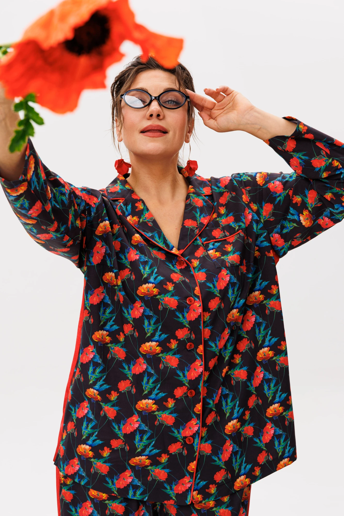 Бархатные лампасы, бегущие по боковым швам, добавляют ноту роскоши и делают силуэт визуально стройнее, а актуальный принт превращает этот комплект в настоящий арт-объект. Он создан не для сна — хотя и в этом он безупречен — а для жизни: для уверенных выходов в город, неформальных встреч и даже романтических свиданий.