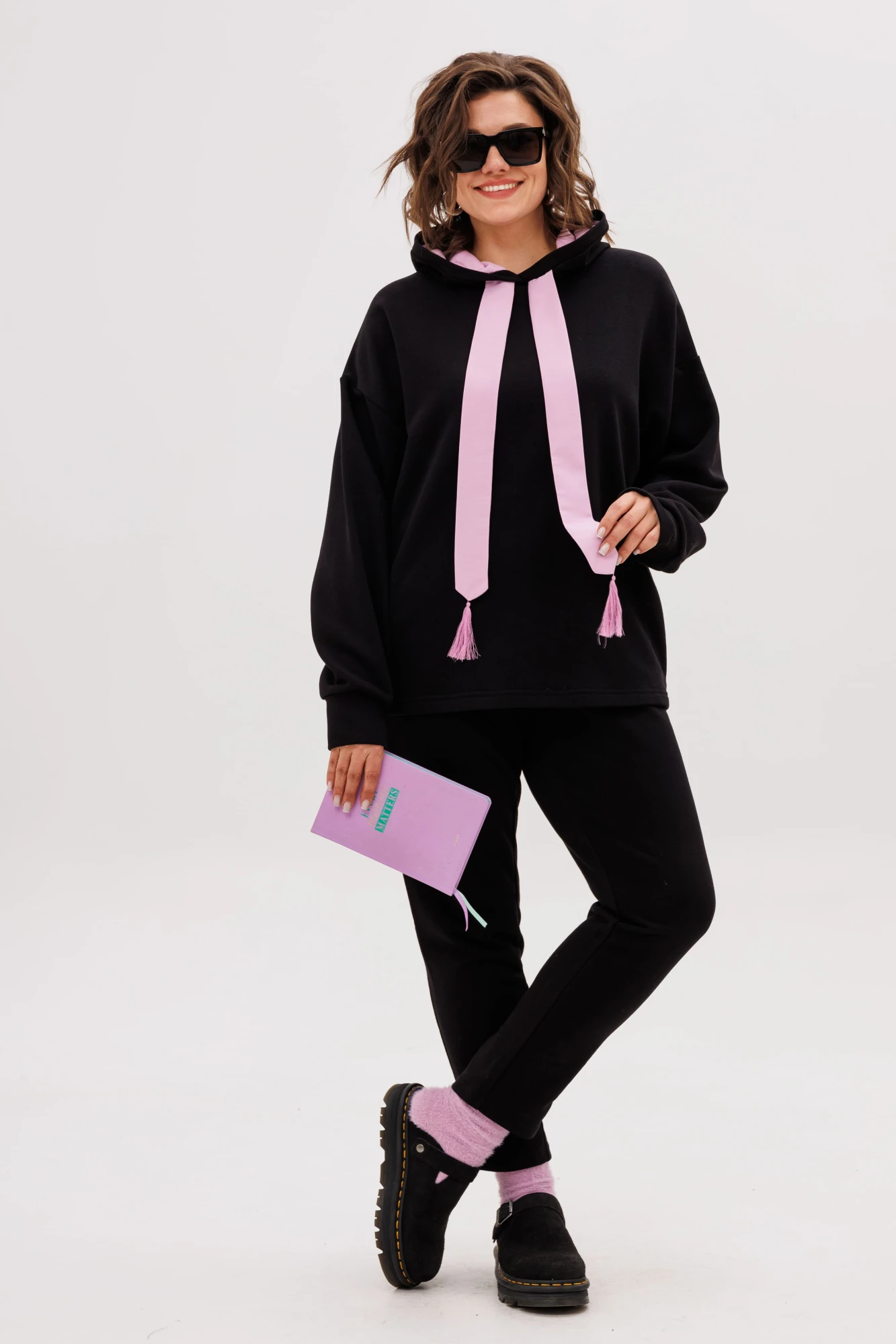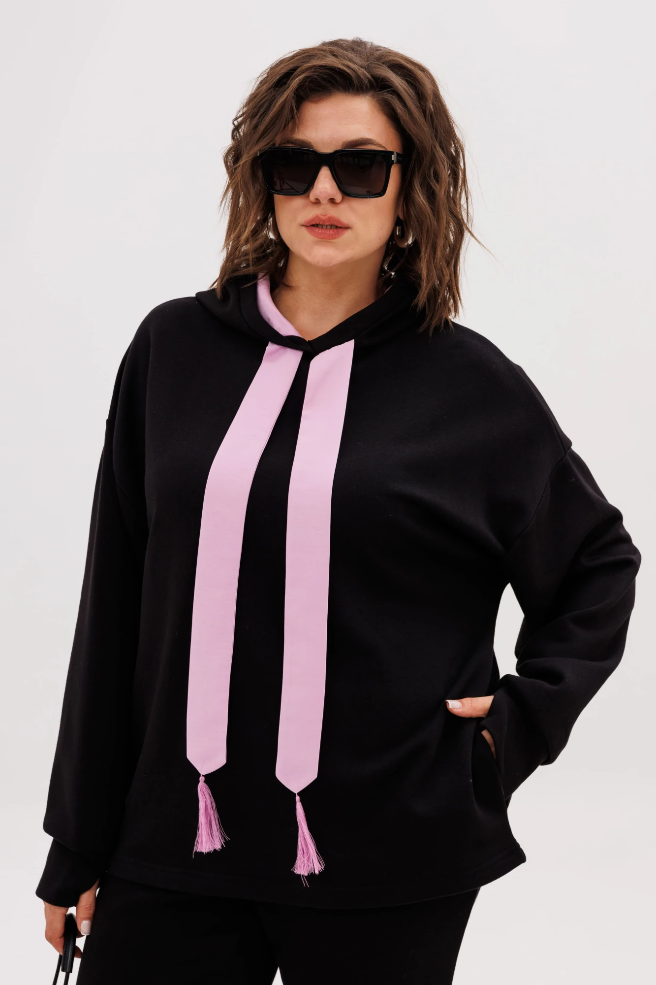 Худи свободного кроя дополнен практичными деталями: удобный капюшон на подкладке, функциональные карманы, скрытые в боковых швах. Декоративные элементы из ткани-компаньона придают модели индивидуальность.