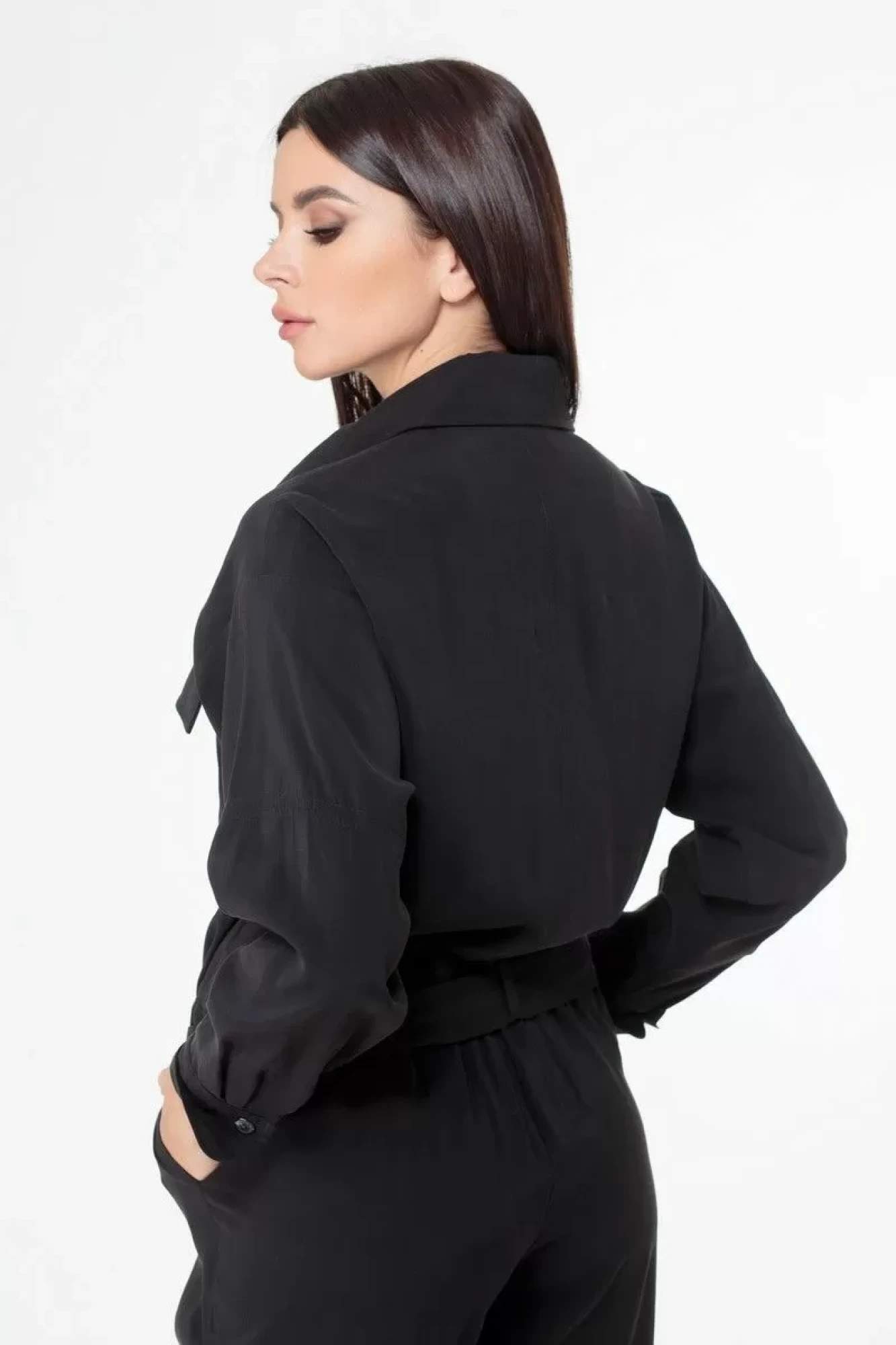 Блузон прямого силуэта, однобортный с потайной застежкой на пуговицы, отлажным воротником на стойке. Низ на притачном поясе с эластичной тесьмой внутри. Накладные карманы с клапанами. Рукава рубашечного покроя с декоративным подрезом с отстрочкой. Низ рукава на притачном манжете. Блузон дополнен съёмным завязывающимся поясом.
