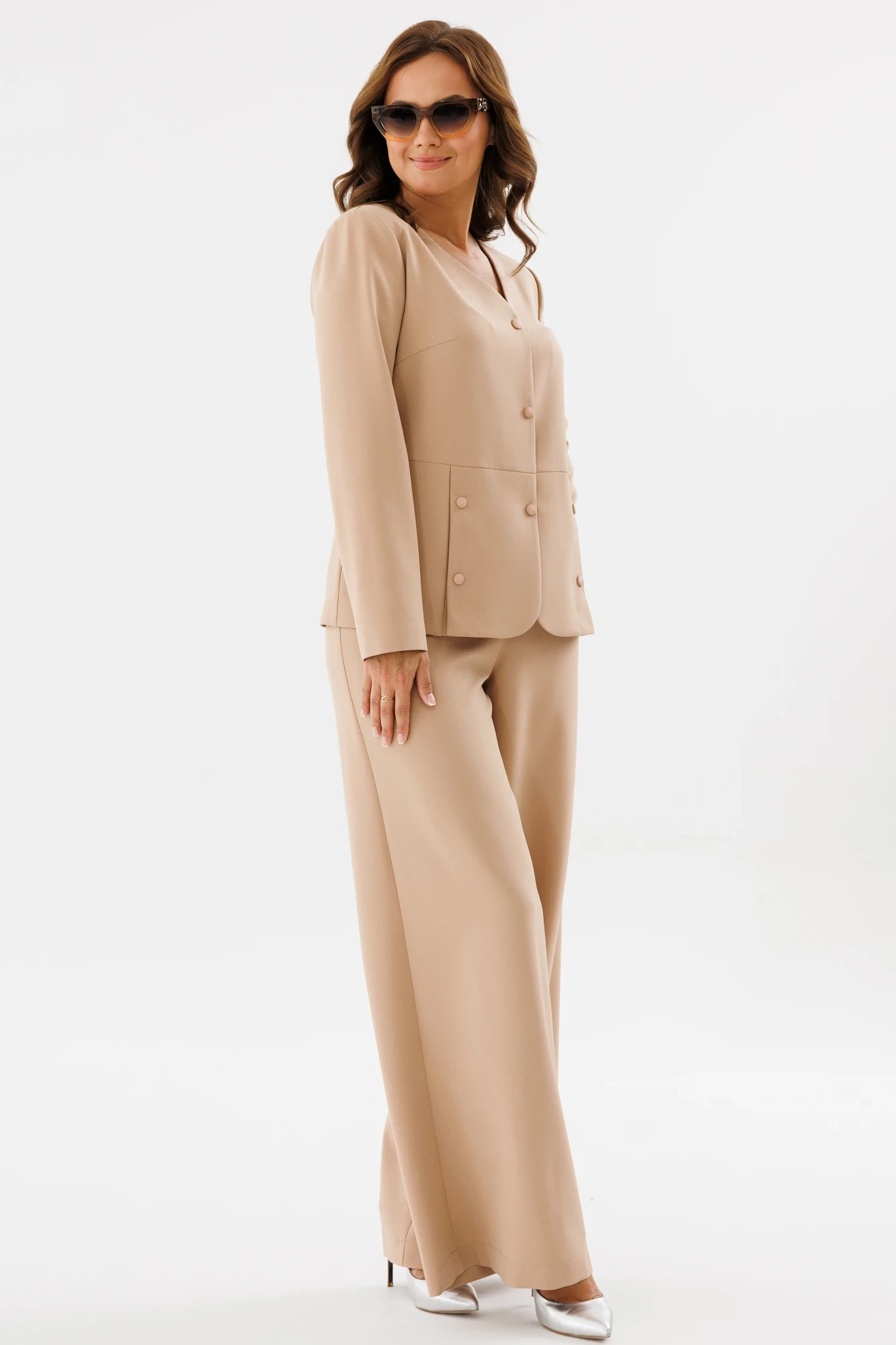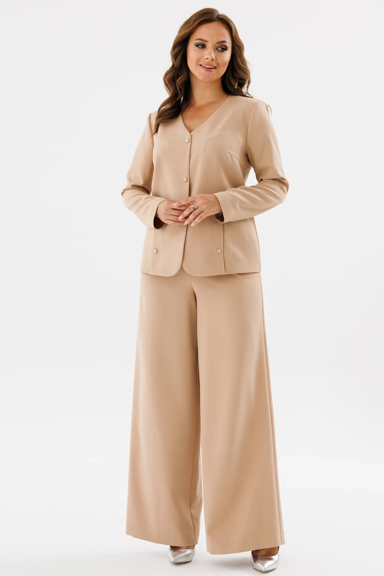 "Комфортный брючный комплект из костюмно-плательной ткани, состоящий из жакета и брюк. Комплект будет идеально смотреться и с классическими туфлями, и с лоферами. Подойдет для работы и офиса, а также повседневной носки.