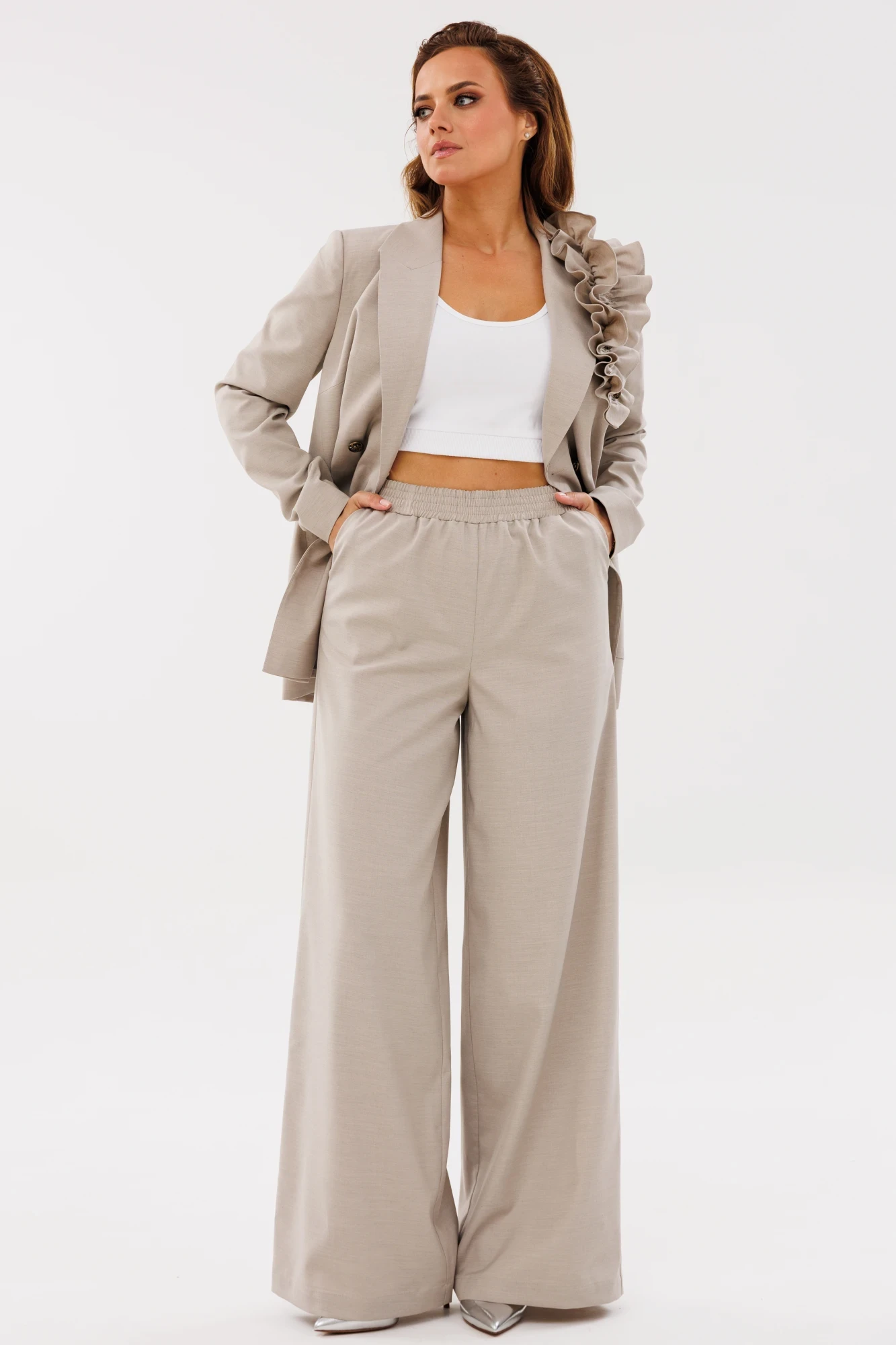 Эффектный брючный комплект из костюмно-плательной ткани состоит из классического прямого жакета и широких брюк-палаццо. Комплект отлично подойдет для работы и офиса, деловых и дружеских встреч, а также для торжественных мероприятий.