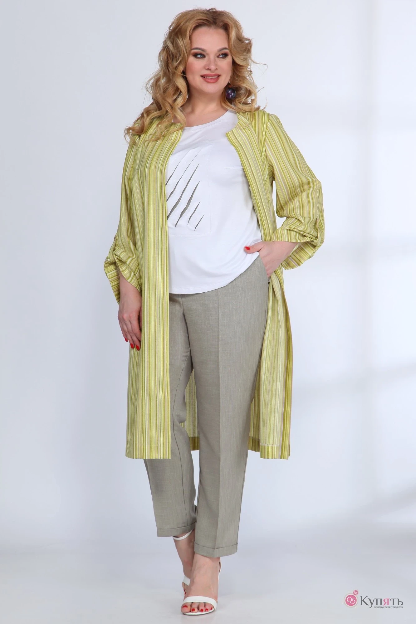Кардиган: Лен 50%, Хлопок 50% Майка: хлопок 60% вискоза 40 % брюки:Лен 50%, Хлопок 50%