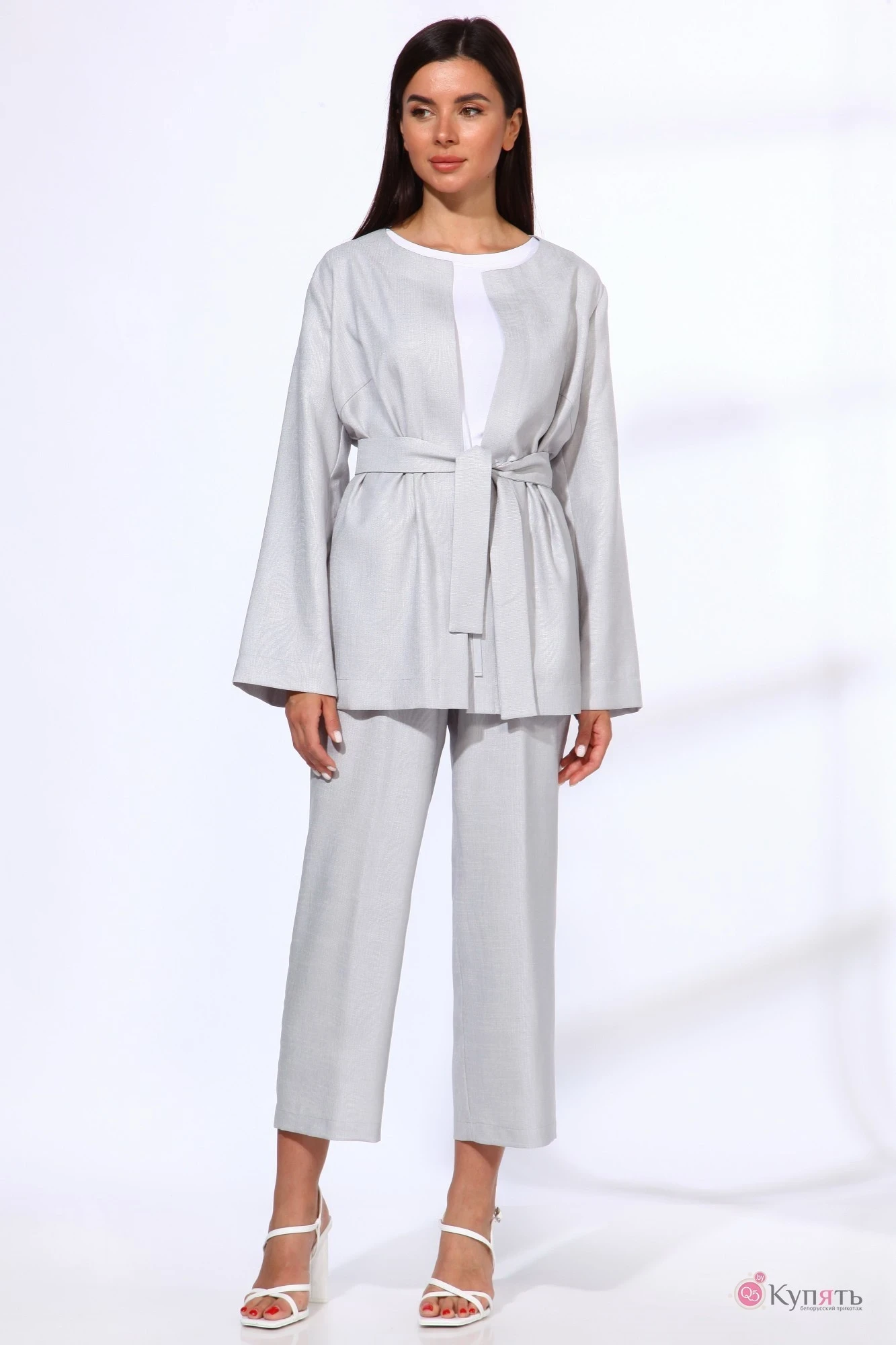 Костюм женский из натуральной ткани, состоящий из кардигана и брюк. Кардиган прямого силуэта, без застежки. Горловина полукруглой формы. Рукав длинный втачной. В комплекте идет съемный пояс. Молодежные брюки-кюлоты свободного силуэта. Пояс собран на эластичную тесьму.