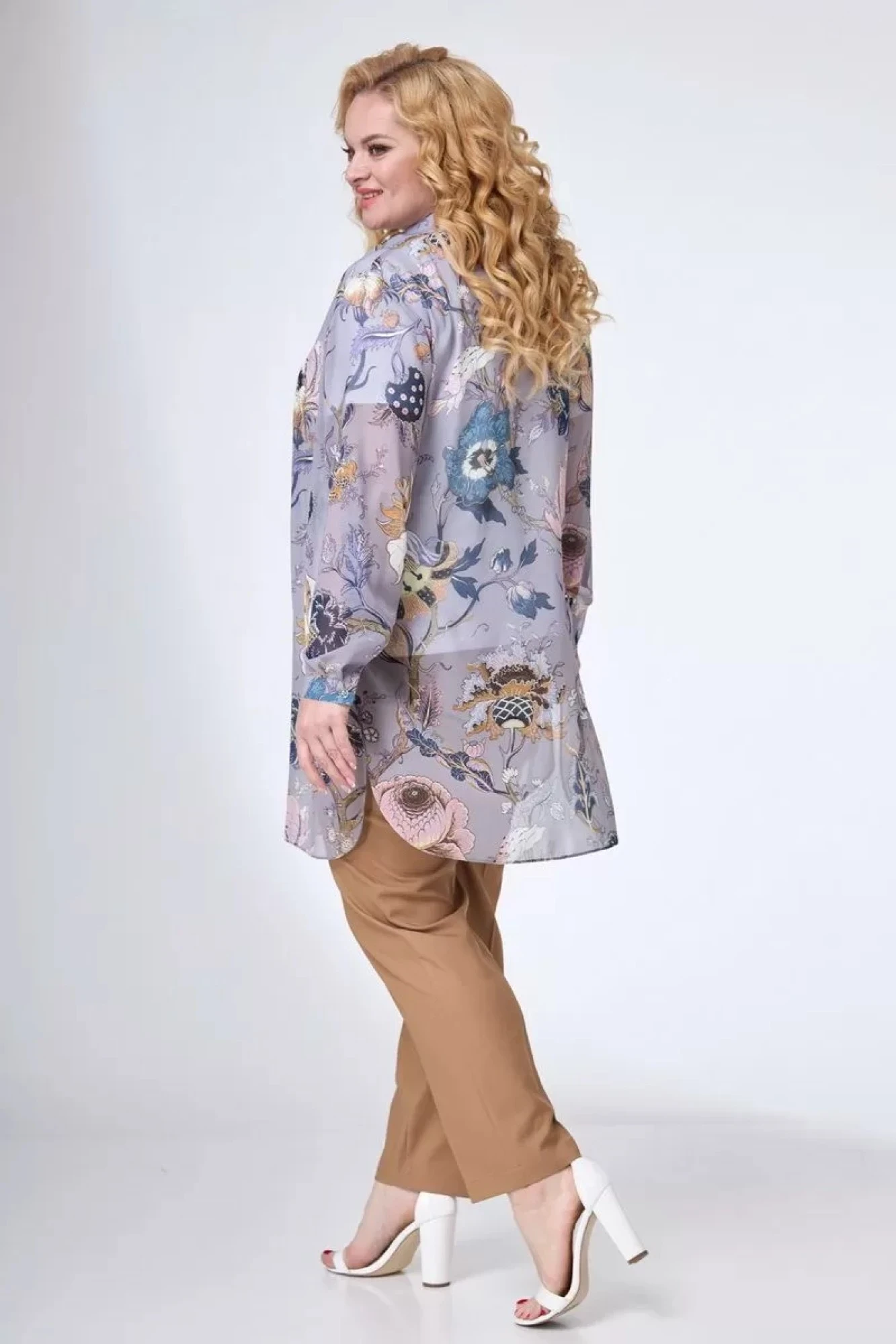 Блузка удлиненная прямого силуэта, с цветочным принтом. Воротник рубашечного типа на притачной стойке. Перед с центральной застежкой на петли и пуговицы на притачных планках. В боковых швах - разрезы. Рукав втачной длинный, с патой и на манжете с застежкой на пуговицу.