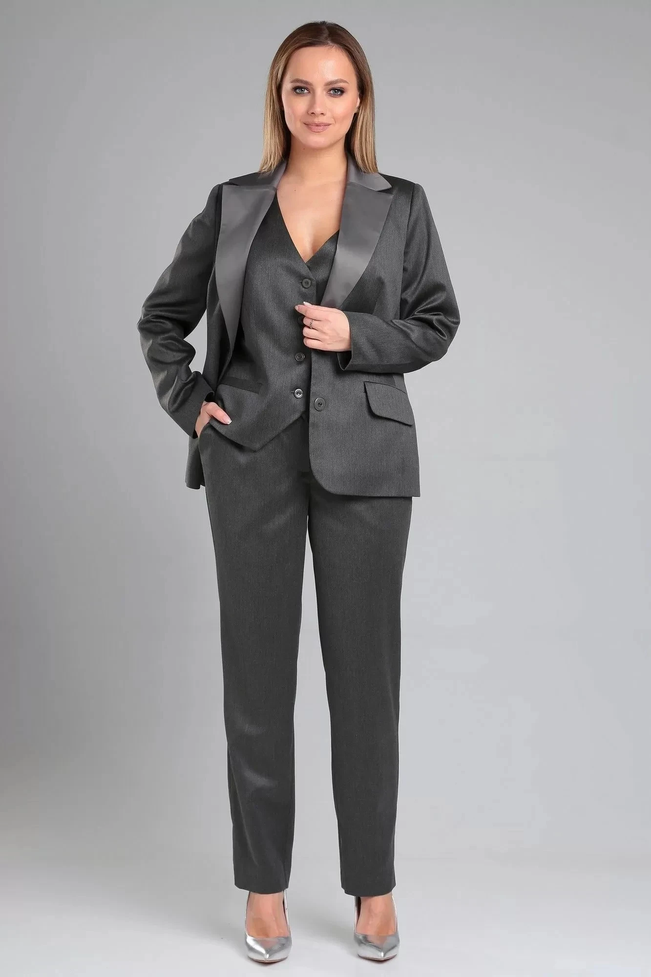 Классический комплект-тройка, состоящий из жакета, жилета и брюк, подчеркнет Вашу элегантность и женственность. Подойдет к деловому образу для офиса, учебы и работы. Однобортный жакет полуприталенного силуэта, на подкладке, с плечевыми накладками. Воротник пиджачного типа с отложными лацканами. По переду центральная застежка на петли и пуговицы и прорезные карманы с клапаном, талиевые вытачки и рельефы. Низ бортов закругленной формы. Спинка со средним швом и рельефами. Рукав втачной двухшовный длинный. Жилет прилегающего силуэта с центральной бортовой застежкой на петли и пуговицы, на подкладке. Вырез горловины V-образной формы. Перед - с талиевыми вытачками и прорезными карманами с листочкой. Спинка со средним швом и талиевыми вытачками. Брюки с высокой посадкой, слегка заужены книзу. Притачной пояс со шлевками и застежкой на молнию и пуговицу, по боковым - вставка из эластичной тесьмы. На задних половинках - вытачки. В боковых швах расположены функциональные косые карманы.